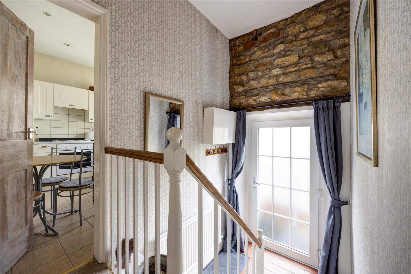 Entrance Hall - Ceramic tiled flooring, radiator, staircase leading to landing, exposed stone wall, double glazed door with textured glass to rear aspect.