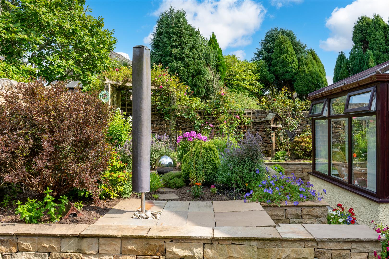 Rear - Pleasant enclosed split level rear garden with sunny patio flagged seating area and established, well stocked beds.