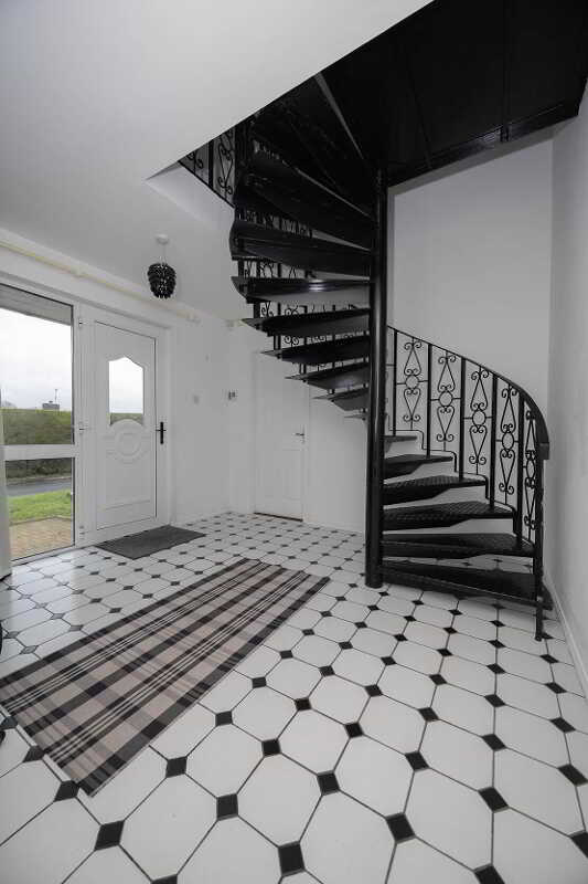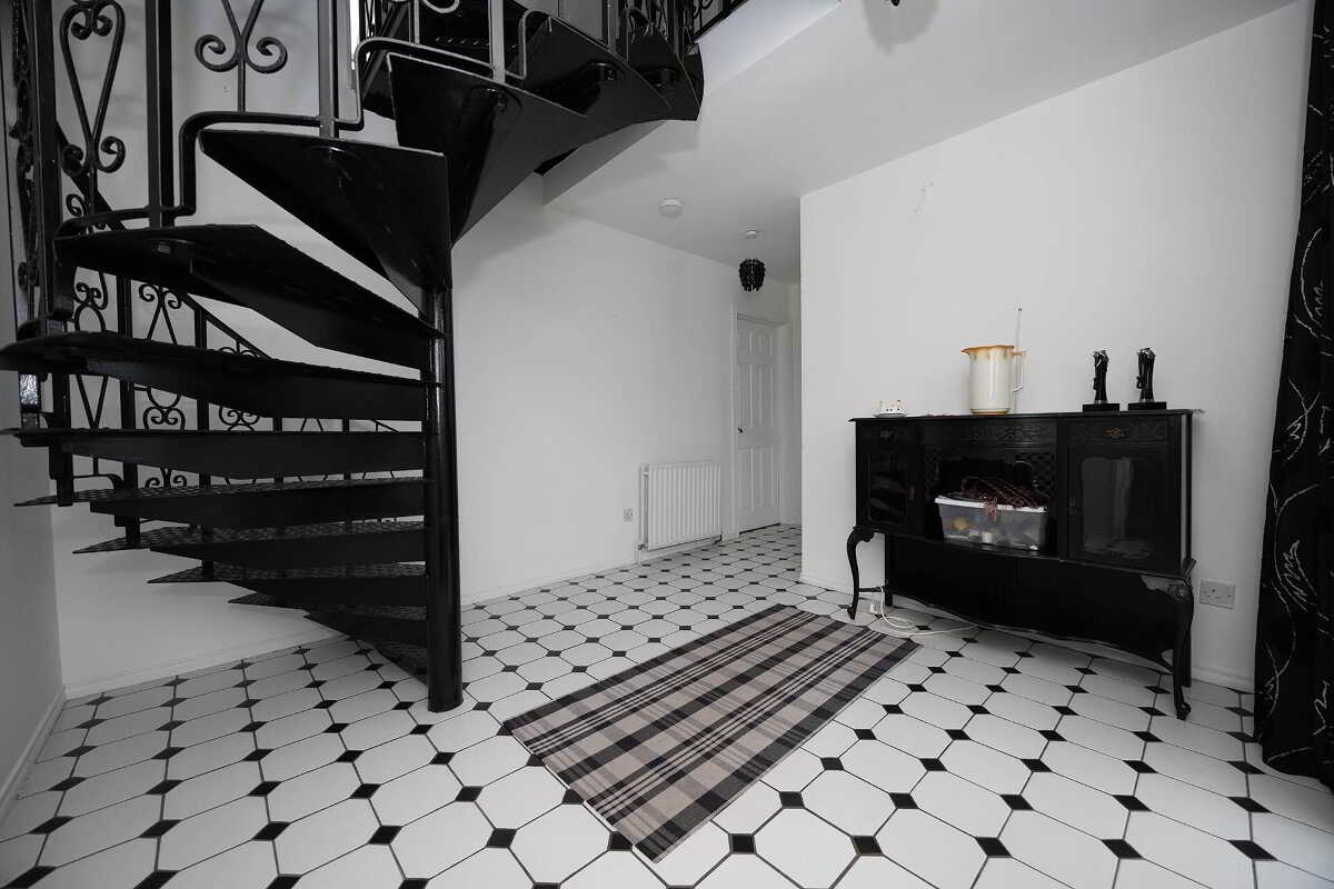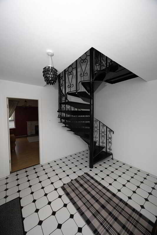 • Elegant hallway boasting a cast iron spiral staircase and classic black & white chequered tiles