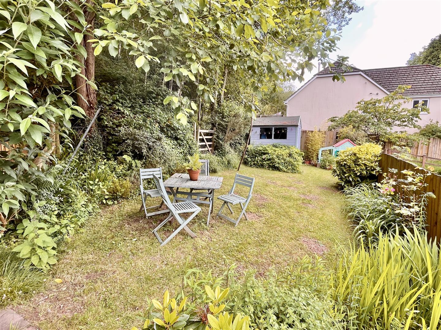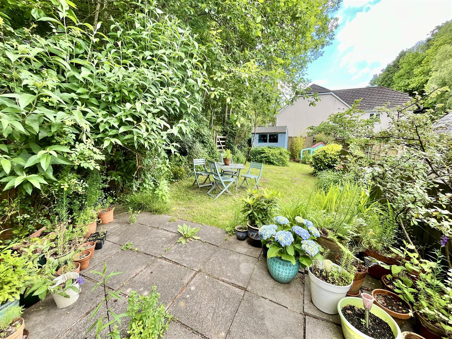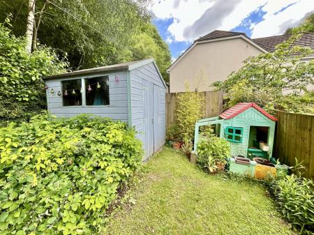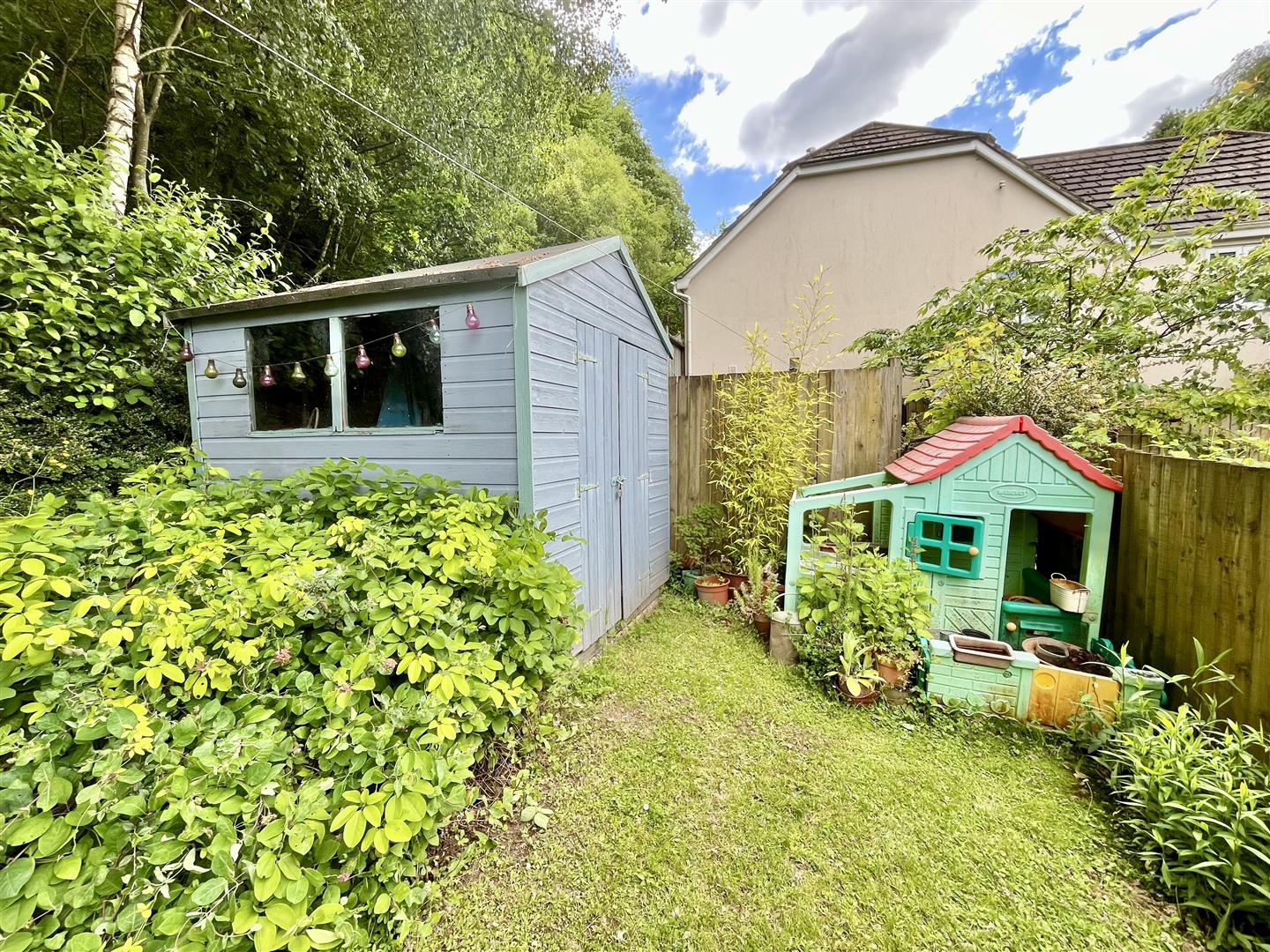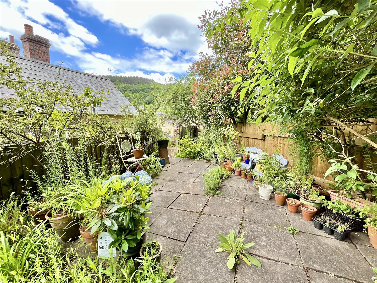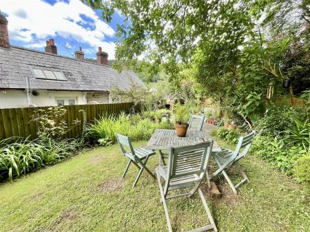At the rear of the property is a private courtyard, accessible from the kitchen and ideal for relaxing. From here, there is a gated right of way across the rear of the neighbouring properties. A metal staircase leads up to a predominantly lawned garden, which features a large patio, a small shed, and attractive flower and shrub borders. The garden offers direct access to woodland, enhancing its peaceful setting.
