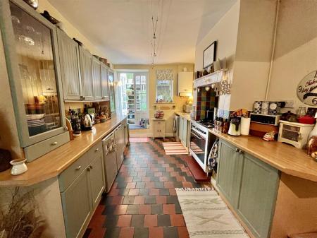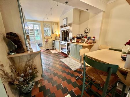 Kitchen - 5.26m x 2.90m (17'03 x 9'06) - Fitted wall and base level units with laminate worktops and a stainless steel sink unit with drainer. Stainless steel electric range oven with gas hob, space and plumbing for a washing machine, fridge and freezer. Radiators, quarry tiled floor, wall mounted gas-fired boiler, rear aspect window and patio doors lead out to the courtyard garden.