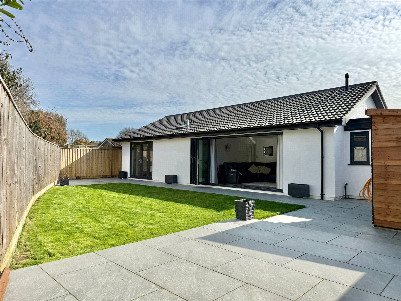 The rear garden has an area of Porcelain paved terrace that extends from the doors from the lifestyle/living space and the double opening doors from bedroom two extending to a further terrace to one corner of the garden with the remainder laid to lawn with fenced boundaries, good sized Timber Garden Store, outside cold water tap and lighting and an area of side aspect storage space. The landscaped front approach has a brick paved pathway leading to the front entrance, brick paved driveway that leads to the garage with the remainder laid to Black Ice stone with a brick paved border, outside lighting, ev charging point, double electric socket