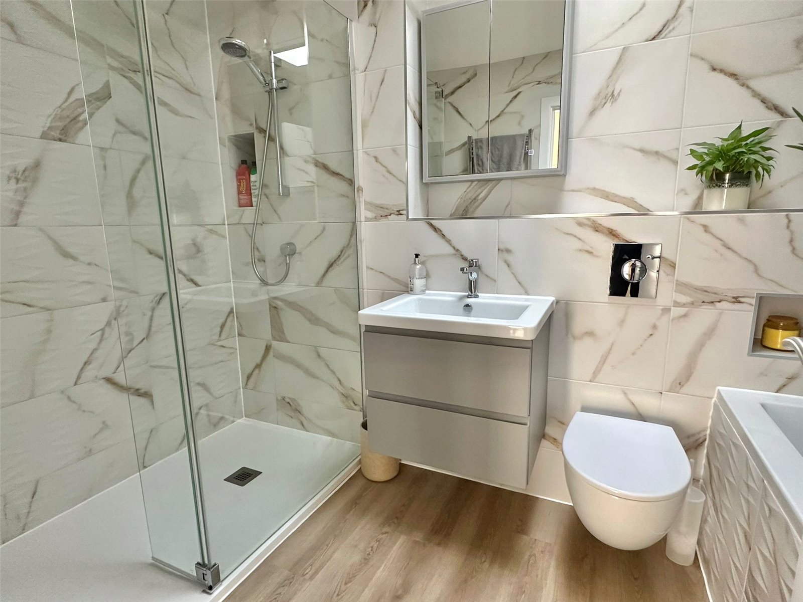 comprising large walk-in shower, bath with hand held shower attachment, vanity wash hand basin with mirror light toiletry cabinet over, concealed cistern wc, heated towel rail, UPVC double glazed Velux window, recess ceiling spotlighting, extractor, recess display shelving