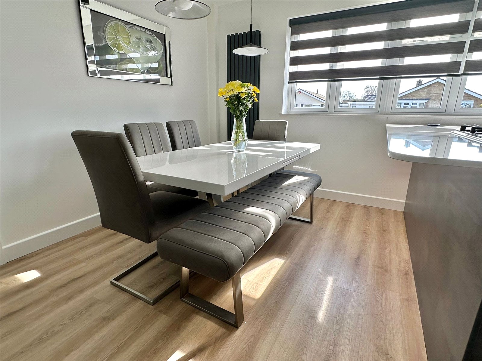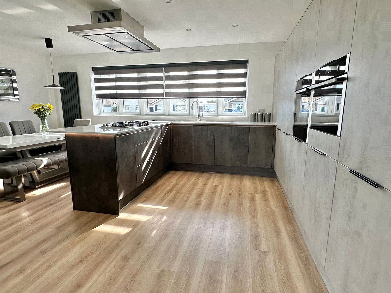 Superb modern lifestyle living space with a sitting area having fully opening aluminium double glazed bi-fold doors overlooking and leading onto the rear garden aspect, wall light point, feature focal fireplace with mantle over and tv media recess, continuation of the oak effect flooring, central heating radiator, space for good sized table and chairs sitting adjacent to the fitted kitchen comprising one and a half bowl mixer Quooker tap sink unit set into a quartz worksurface with undercounter lighting and pop up plug point, base cupboard and drawer units and matching eye level cupboard units incorporating a breakfast bar overhang, integrated double oven and microwave, five ring gas hob with extractor over, integrated fridge freezer, concealed in a cupboard is the wall mounted Glow Worm gas fired central heating boiler, integrated dishwasher, ceiling light points, upright radiator, UPVC double glazed windows with quartz windowsill to the front aspect. Door from the lifestyle living space leads to:
