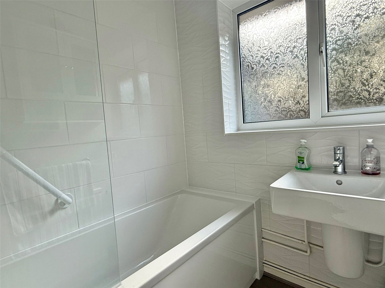 Bath with shower and shower screen, ceiling light point, UPVC double glazed obscured glass window, pedestal wash hand basin, built in cabinet, shaver point, central heating radiator