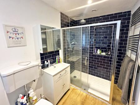 A beautifully finished, modern bathroom with large walk in rainfall shower and separate full-size bath, vanity unity providing good storage, and obscure window overlooking from aspect.