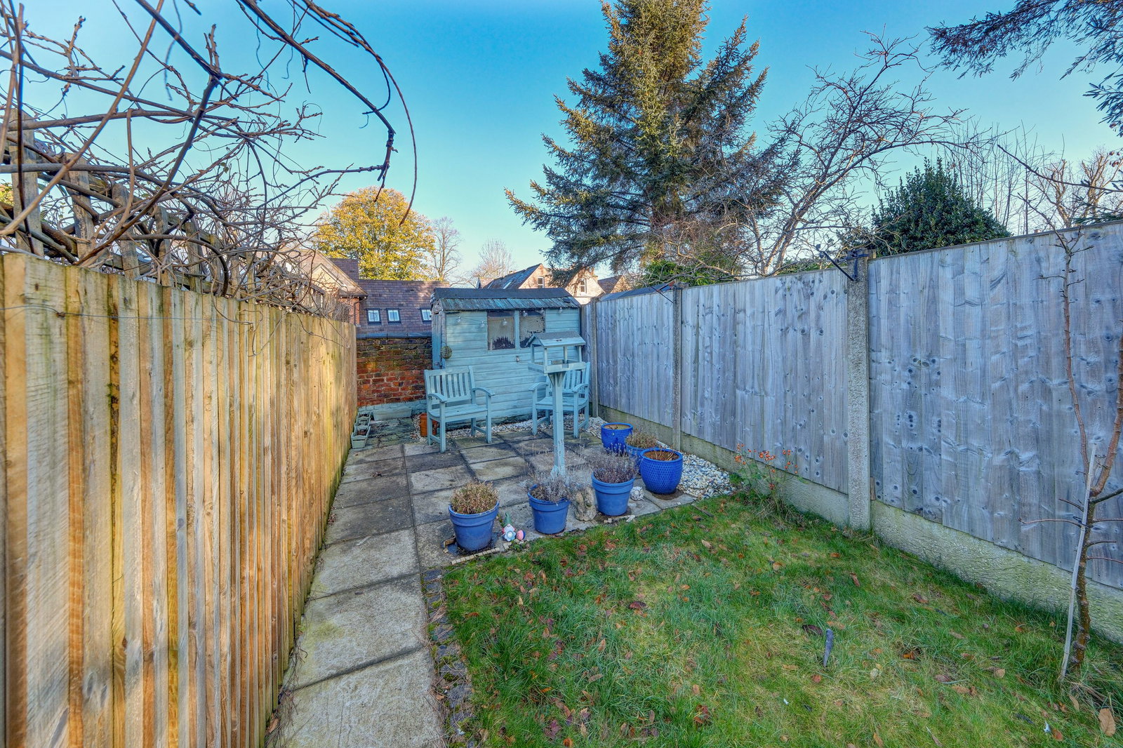 - Enclosed rear garden with patios, lawn, and apple trees