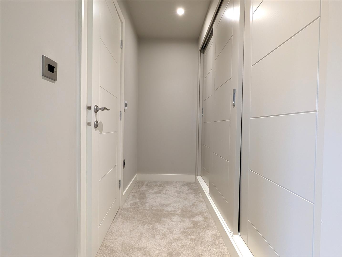 Floor to ceiling fitted cupboards, discreetly positioned along the entrance hallway