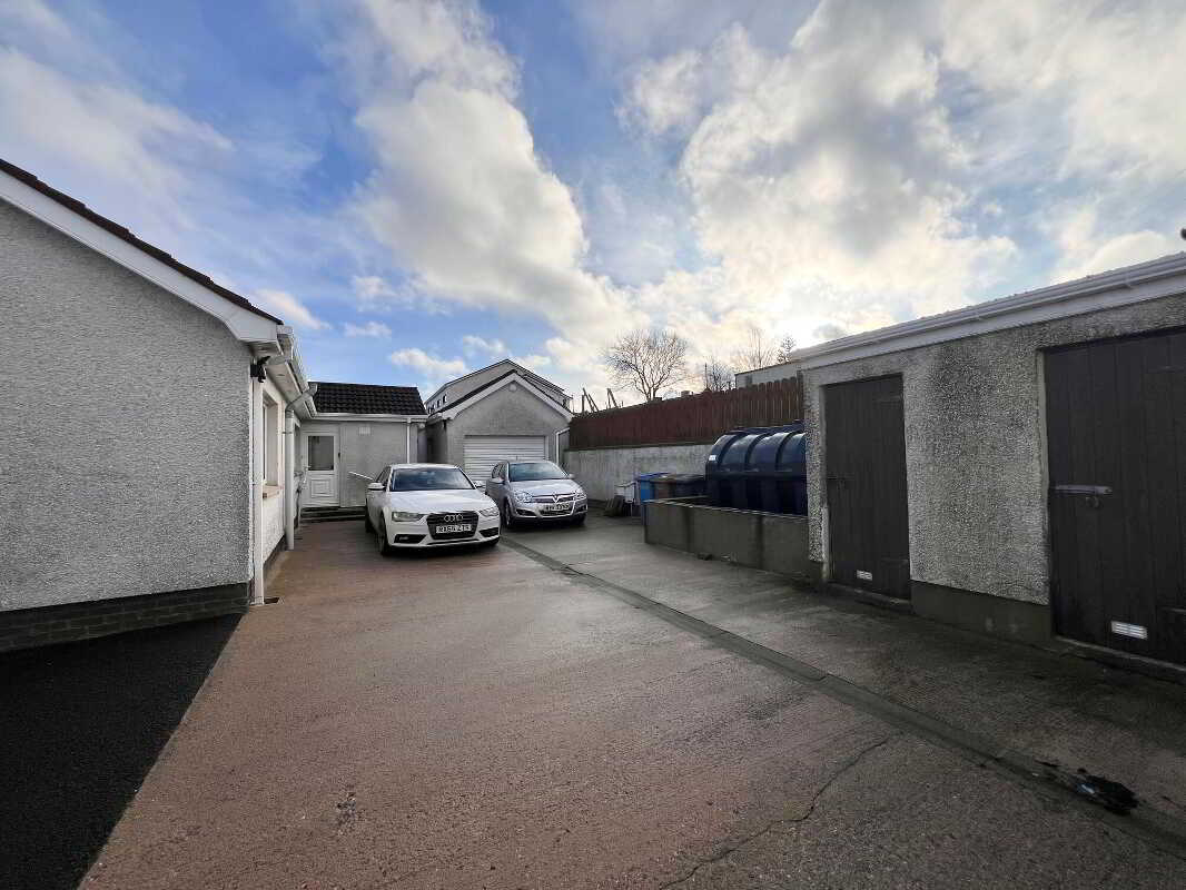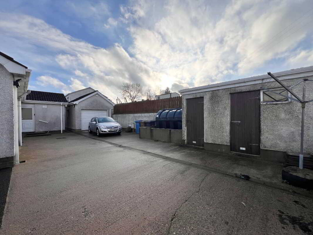 • Generous plot featuring front gardens, a tarmacadam driveway, detached garage, two storage sheds and concrete yard to the rear offering excellent parking