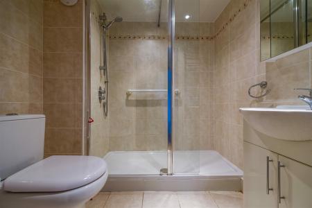 Shower Room - walk-in shower cubicle with mixer shower, wash hand basin in vanity unit, low level w.c, tiled walls, tiled floor, heated towel rail, spotlights to ceiling