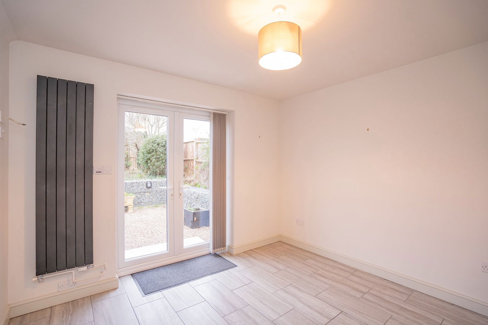 Double glazed pedestrian door giving access to the garden.  Double glazed window, radiator, wall light point and entrance to