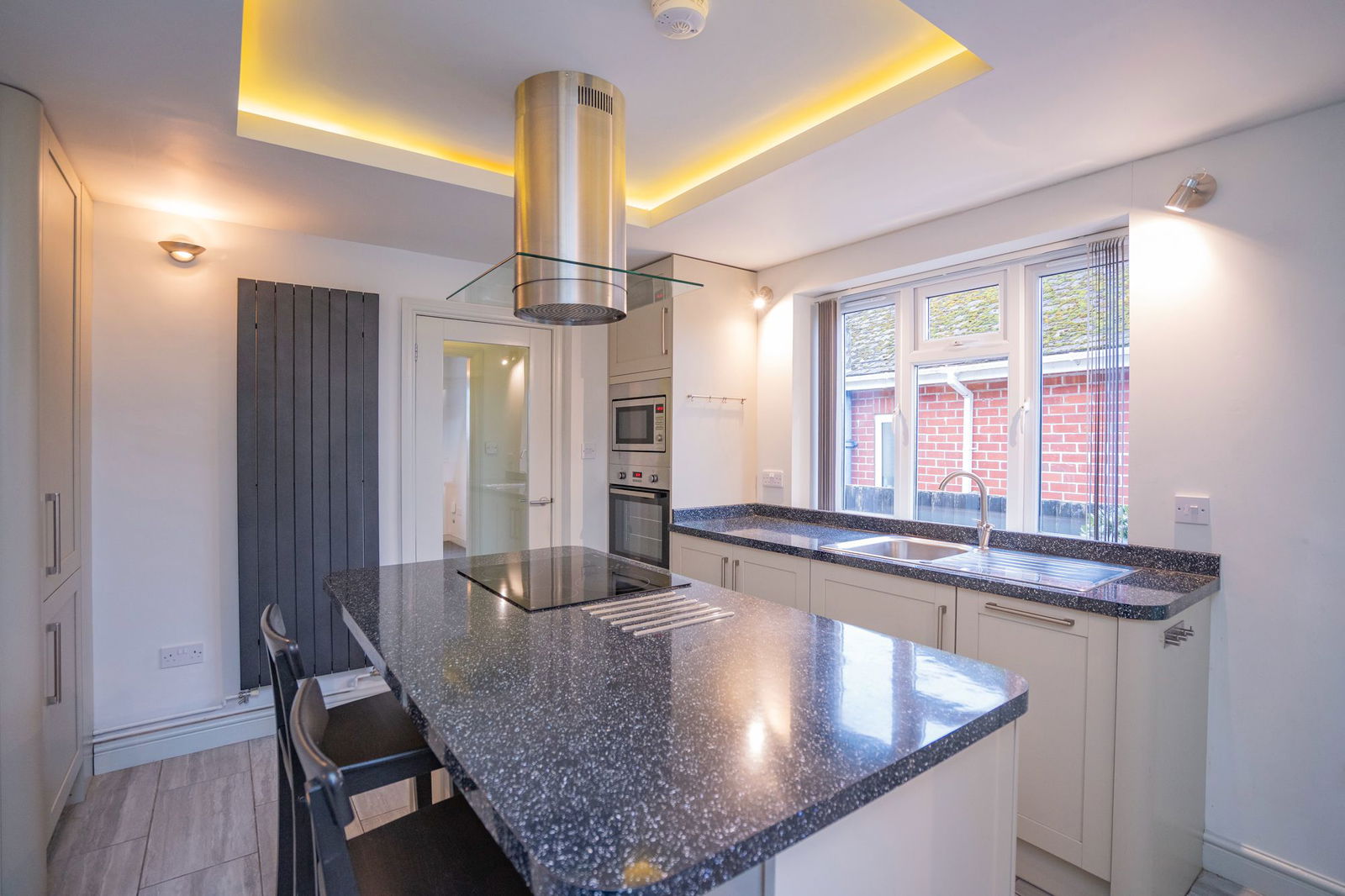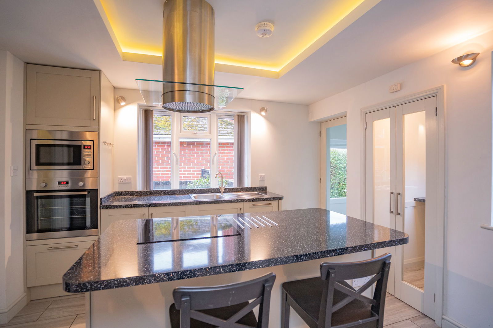 Accessed from the entrance hall and fitted with a beautiful range of shaker style, drawer and cupboard base units with chrome handles incorporating a wine rack.  Worktops with matching splashbacks set into which is a stainless steel sink unit with mixer tap, drainer under a double glazed window.   Range of integrated appliances including and electric COOKER with central extractor over set into a breakfast bar island offering addition drawer and cupboard space and a WINE FRIDGE.  Slimline DISHWASHER, OVEN with MICROWAVE over.  Above the island is a central recessed lighting space, wall light points and a modern vertical radiator.  Tiled floor flows throughout and a door gives access to a side porch (described later) and further double doors open to a useful PANTRY with worksurface space and space for fridge, double glazed window to side.   An entrance with additional cupboards to either side open to