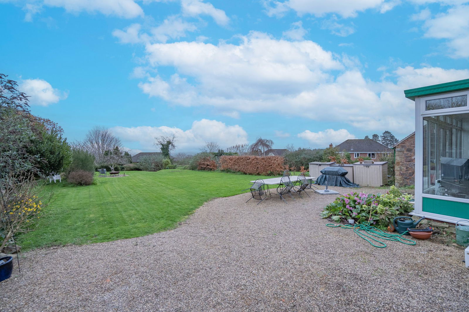 To the front there is a lawned section with hedge and tree border.