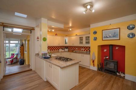 The kitchen diner has a bespoke and high quality finish and is the perfect entertaining area, ideal for family living.  Wood burning stove.  Range of base and eye level units with granite worktops.  Ceramic sink and drainer, five ring gas HOB and space for a dishwasher.  A separate bank of units has a built in wine cooler, OVEN, GRILL and MICROWAVE and space for an American style fridge freezer.