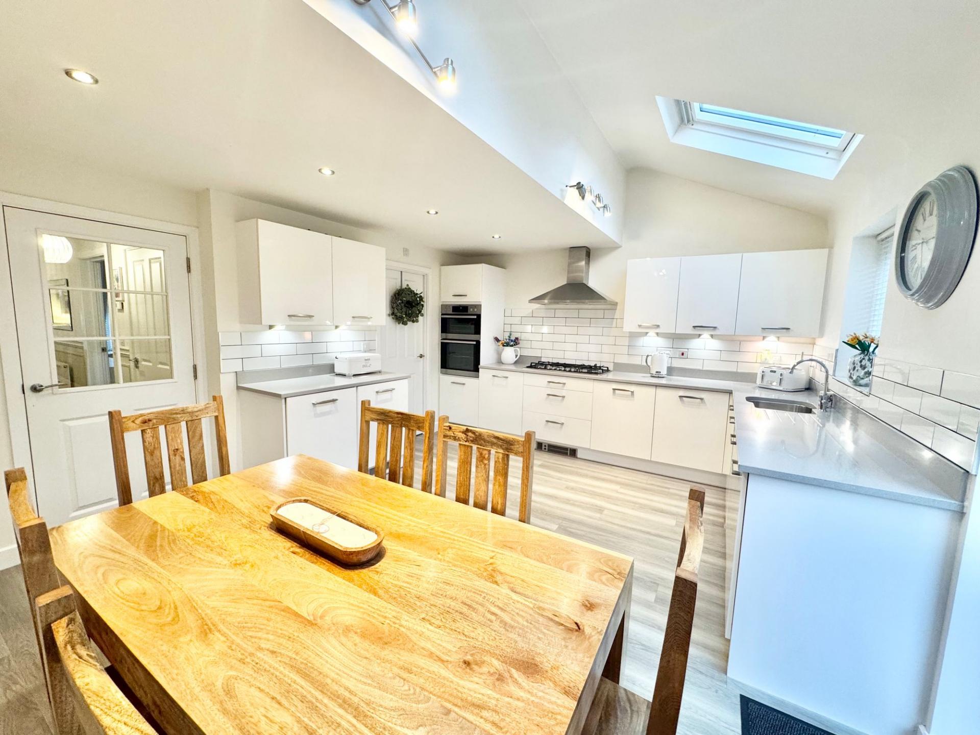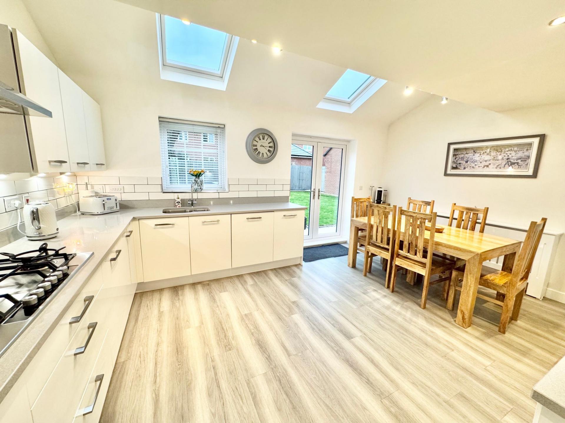 - Stunning open-plan kitchen diner flooded with natural light from skylights and French doors, featuring granite worktops and high-spec integrated appliances throughout.