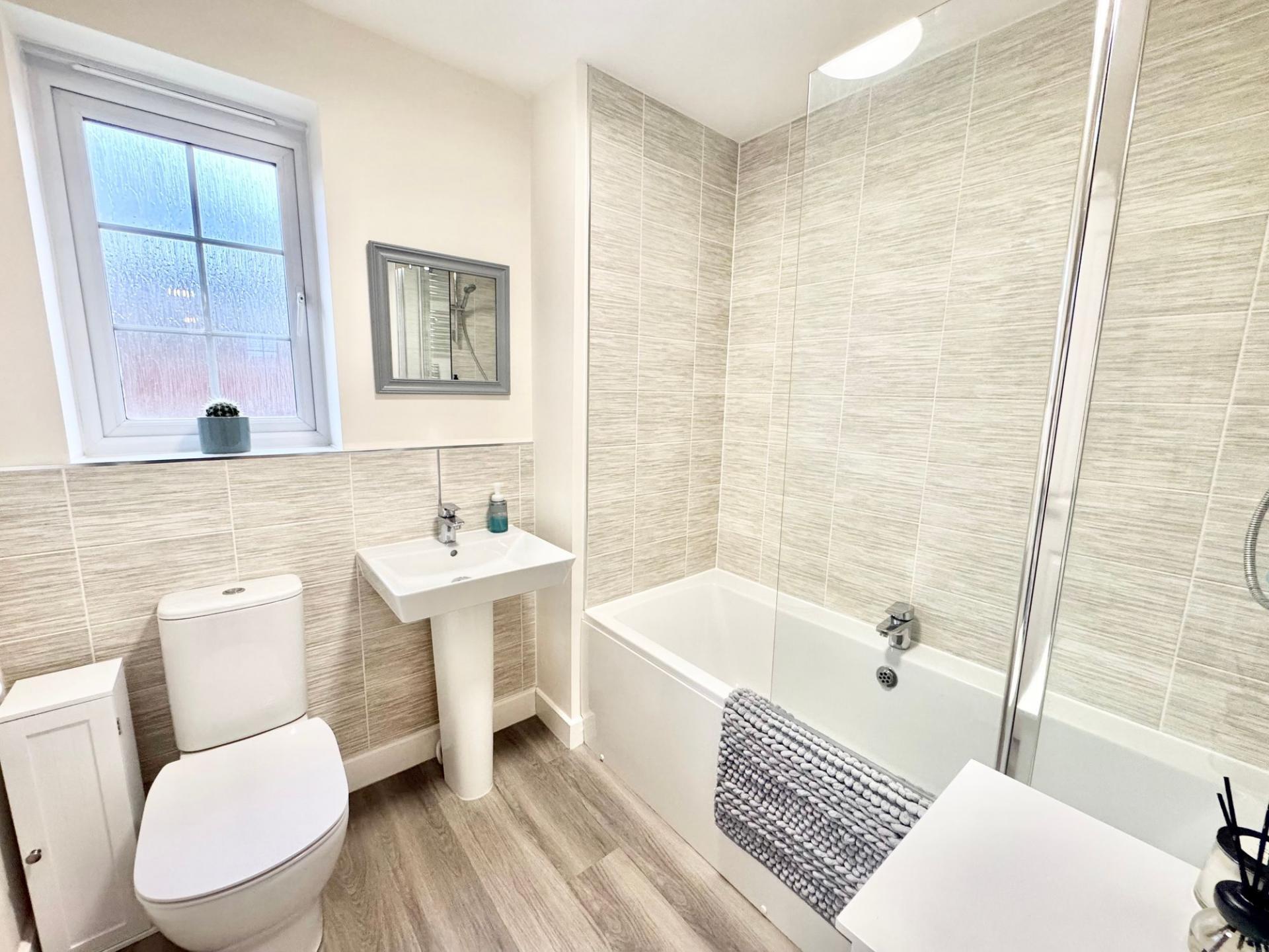 - Generous rear garden mainly laid to lawn with patio area and central pathway leading to a private seating space, all enclosed for privacy and ideal for outdoor living.