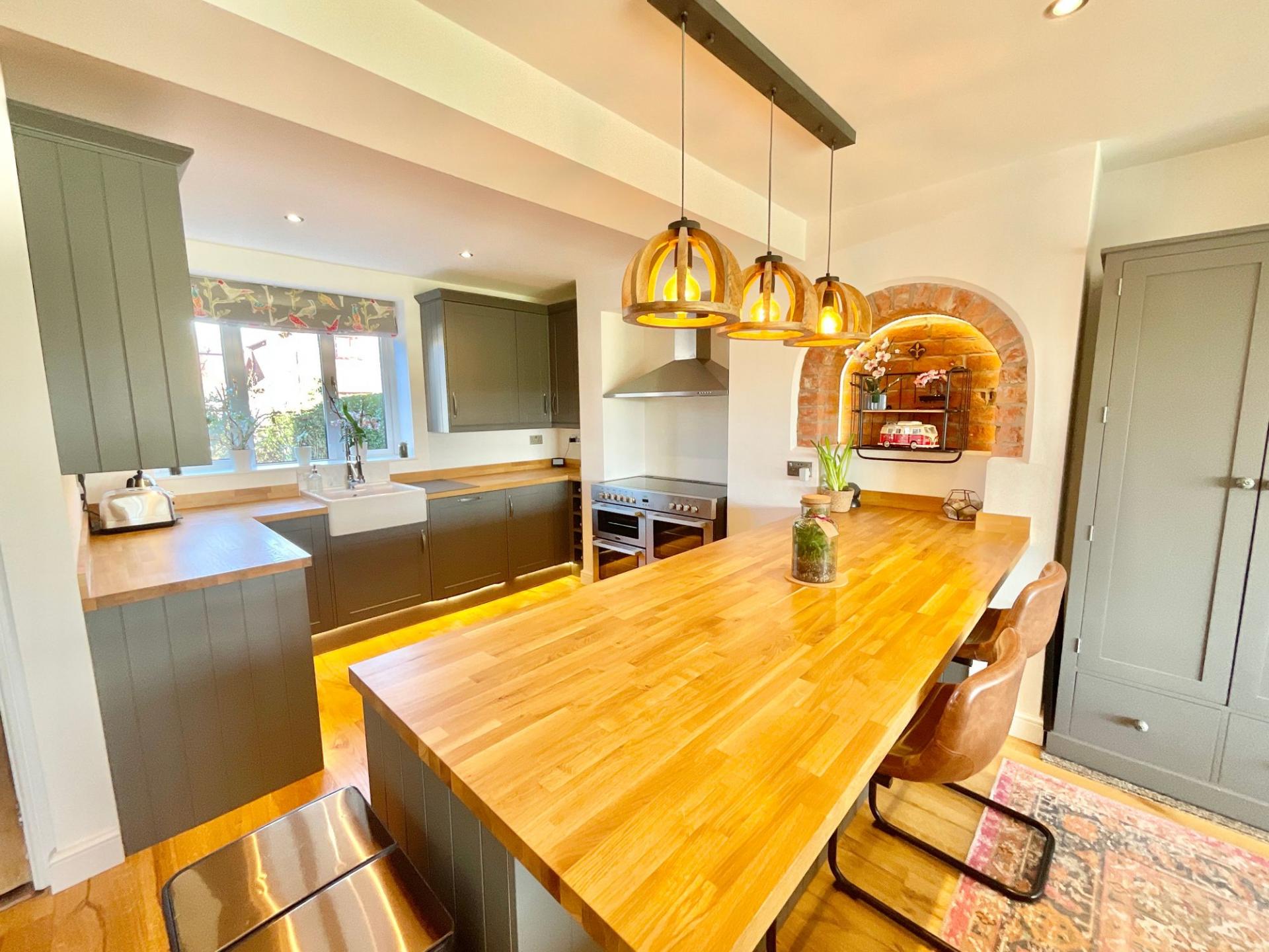 - Stylish kitchen with sage green units, hardwood worktops, Belfast sink and range cooker, perfect for home chefs, relaxed breakfasts or hosting memorable dinner parties with friends.