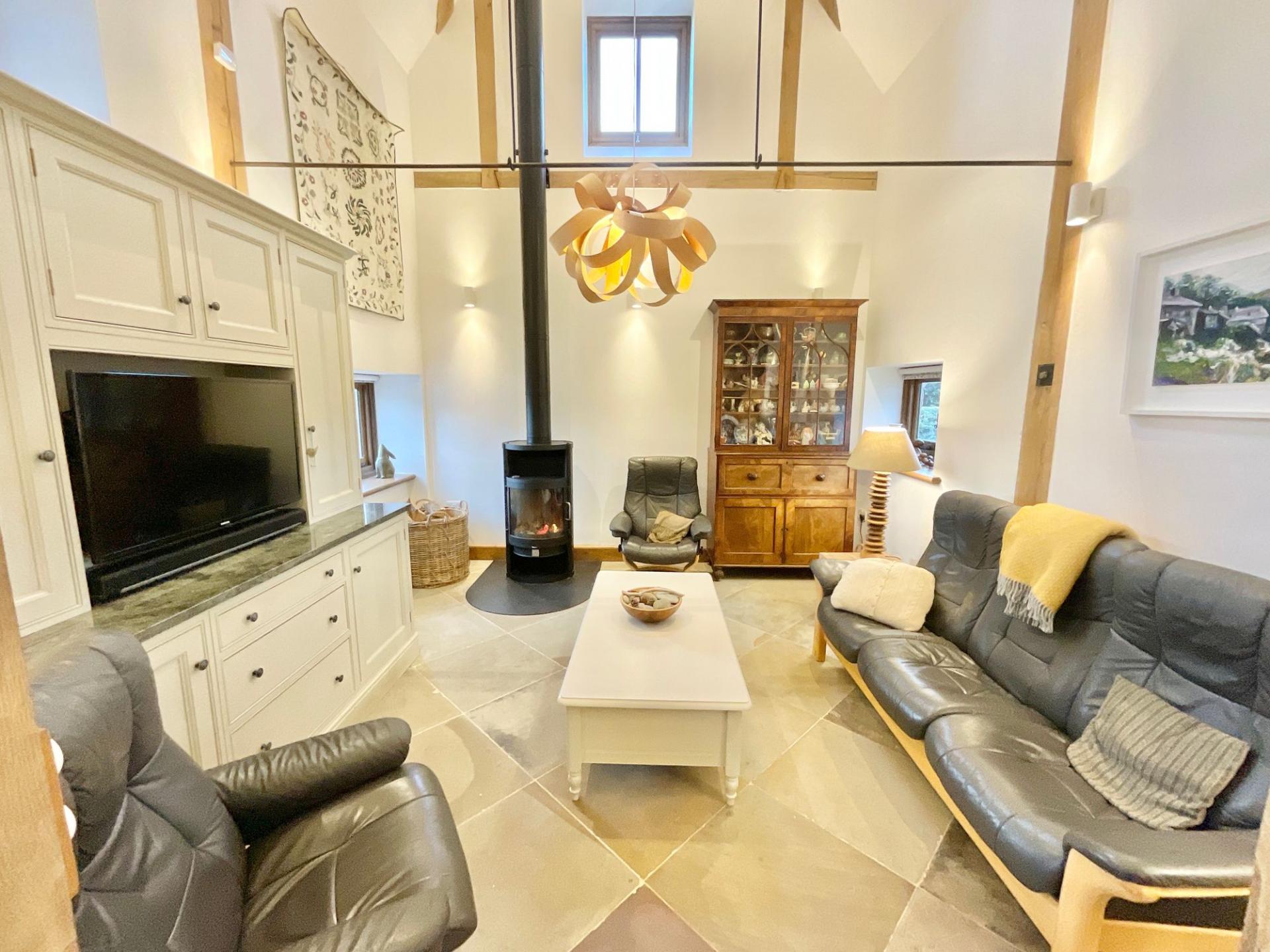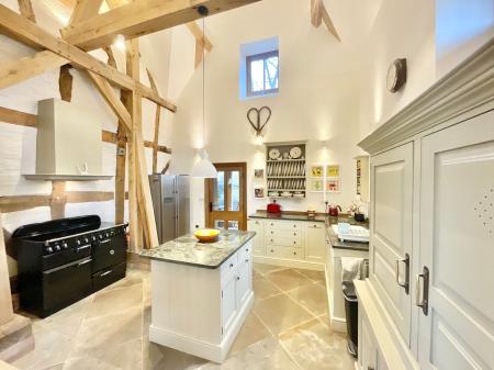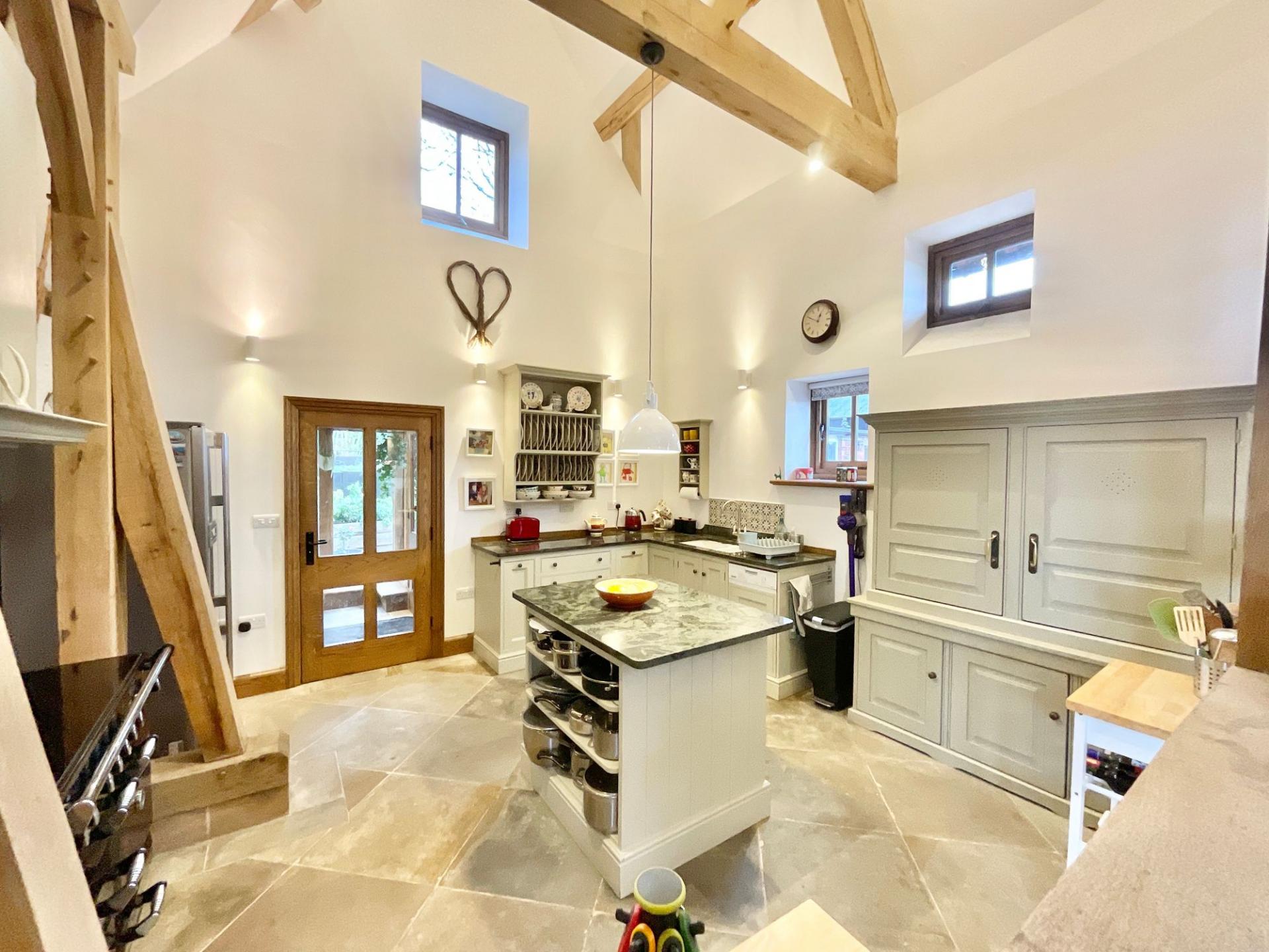 - Link attached, oak framed Tudor barn conversion, creating a vaulted open-plan kitchen, dining and family room with underfloor heating, Yorkstone floor and retained original features.