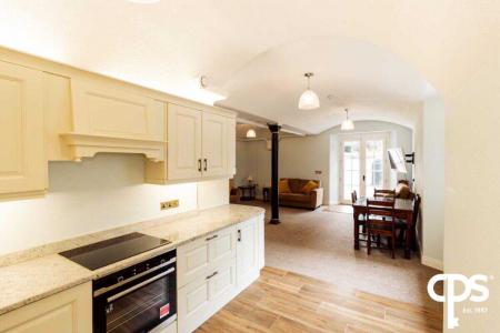 This spacious long galley styled kitchen comes with tiled flooring throughout and comes with a number high and low storage units that have been constructed in solid wood alongside granite worktops. The kitchen benefits from ample space for kitchen appliances, has a fitted double Belfast sink and also has fixed ceiling spotlights. There is a small utility area just off the kitchen.