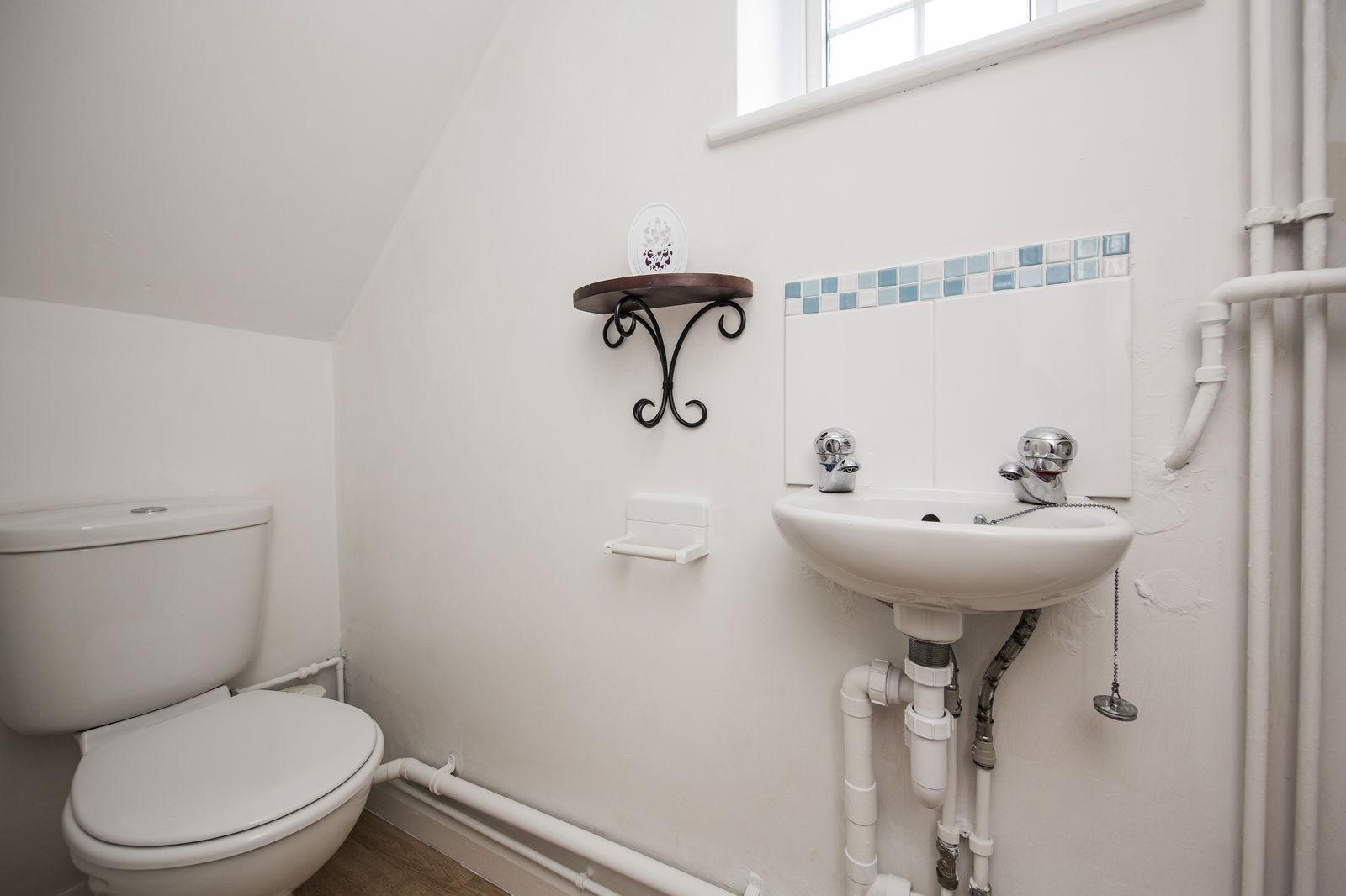 CLOAKROOM: Double glazed window. WC. Wash basin. 'Worcester' gas-fired boiler. Fuse box. Wood effect flooring.