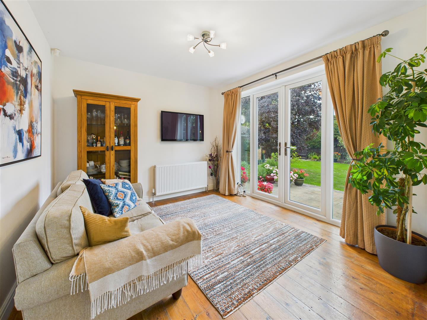Living Kitchen - A superb space to the rear of the property with window overlooking the garden and double doors opening out to the paved terrace. There is ample space for settee/dining suite. The kitchen has a stunning range of units with contemporary quartz work surfaces and a central matching island with breakfast bar peninsular. The kitchen also features an undercounter sink with mixer tap, range cooker with extractor hood above, dishwasher, wine chiller, integrated fridge freezer and double opening pantry cupboard.