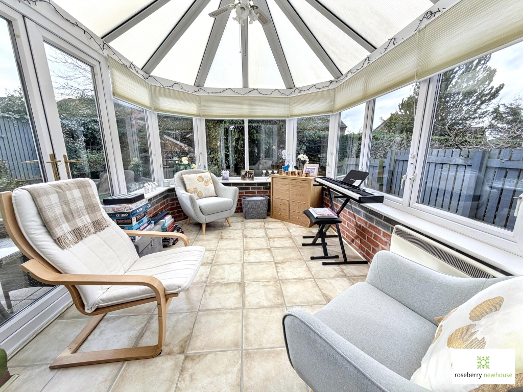 The welcoming entrance hall sets the tone, leading through to a comfortable living room with glazed doors opening into the conservatory beyond. This arrangement creates a natural flow of space, ideal for both family living and entertaining, with the conservatory enjoying views over and direct access to the rear garden.