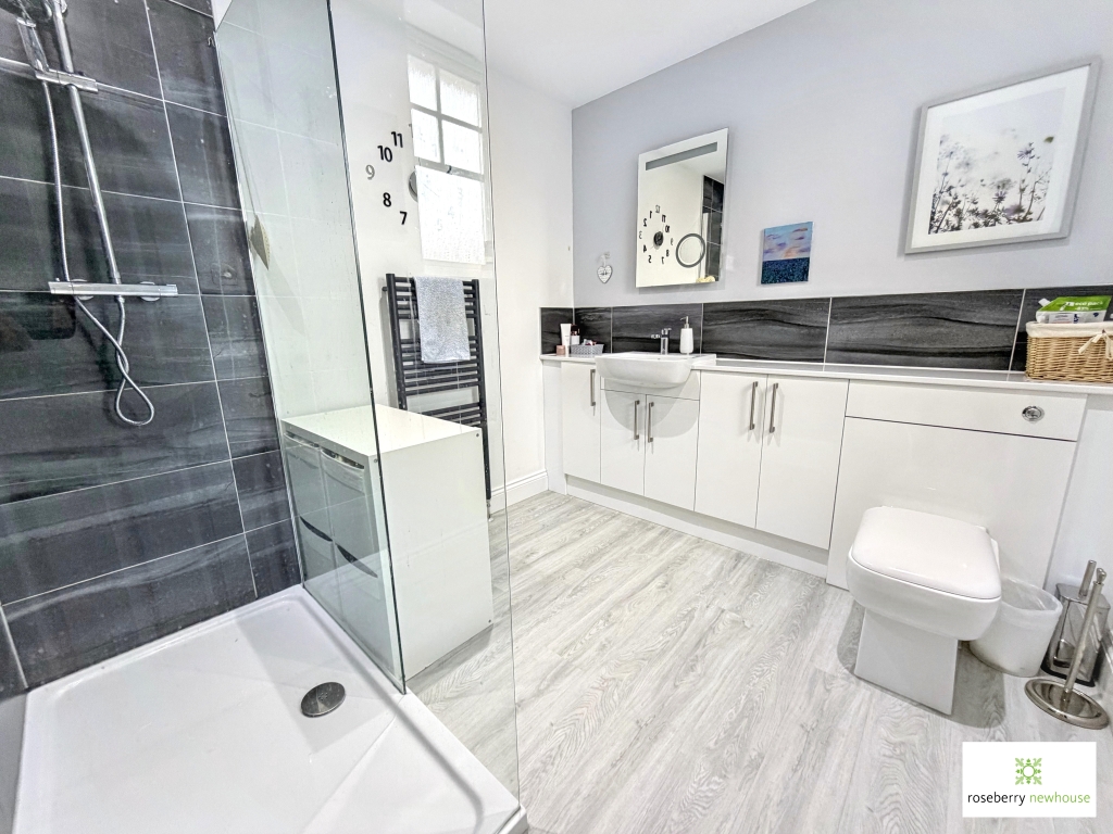 To the first floor, the principal bedroom benefits from a range of fitted wardrobes and a generous en suite shower room, creating a comfortable and private retreat. There are three further well-proportioned bedrooms, all thoughtfully presented, along with a modern family shower room serving the remaining accommodation.