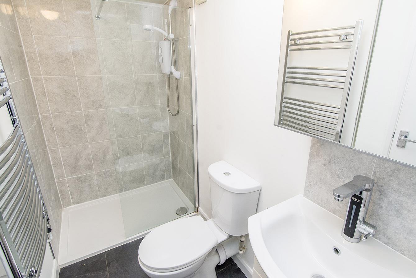Shower Room - 2.77m x 1.22m (9'1 x 4'0) - Comprising: Double shower enclosure with wall tiling, low level WC and wash hand basin over a fitted vanity unit. Skylight. Extractor. Tiled flooring. Chrome heated towel rail.