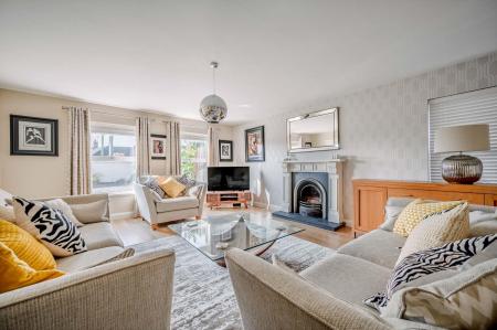 Family Room - (5.66m x 4.67m) - Attractive fireplace with cast iron inset, slate hearth and open fire, laminate wood effect floor.