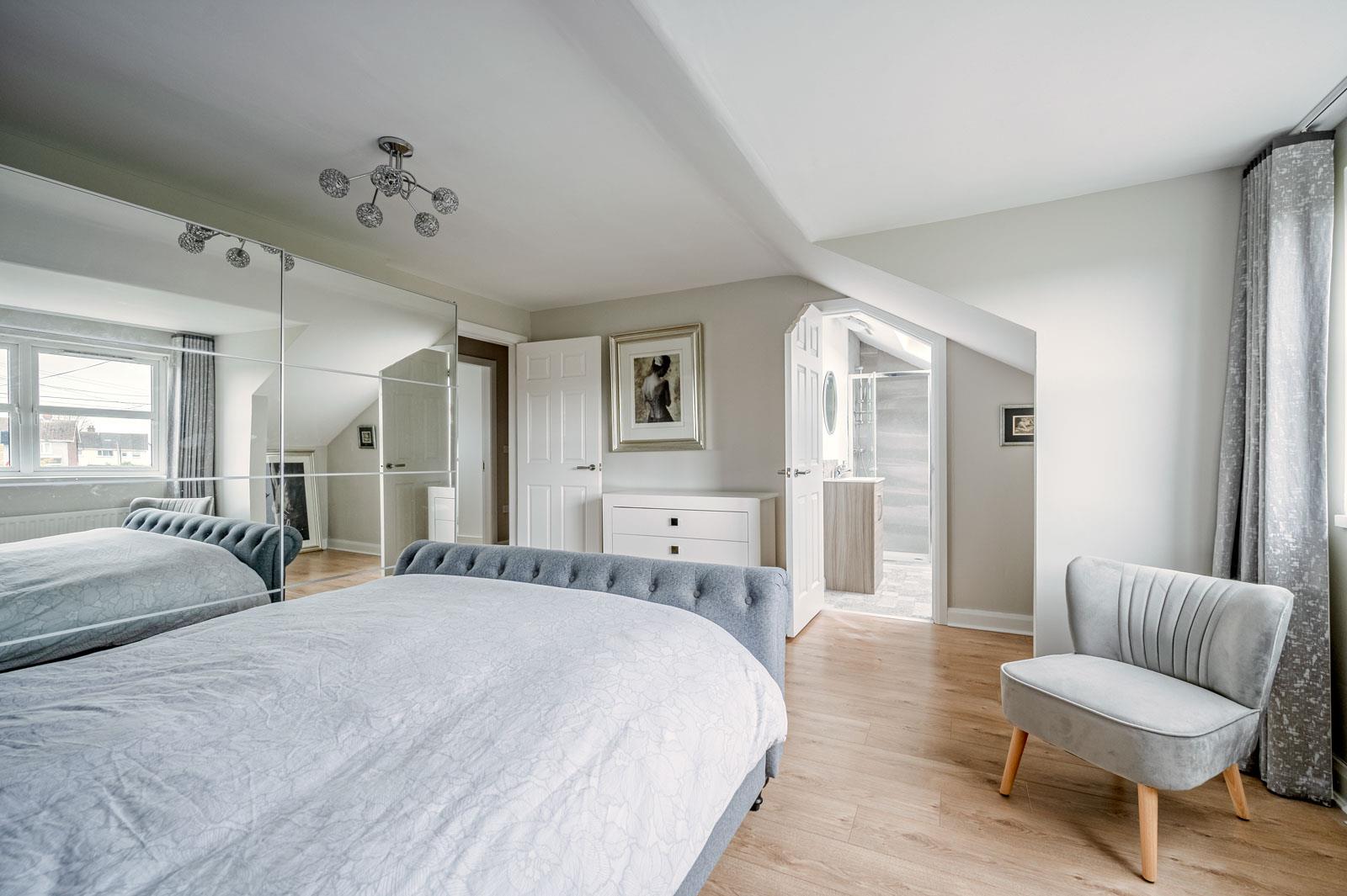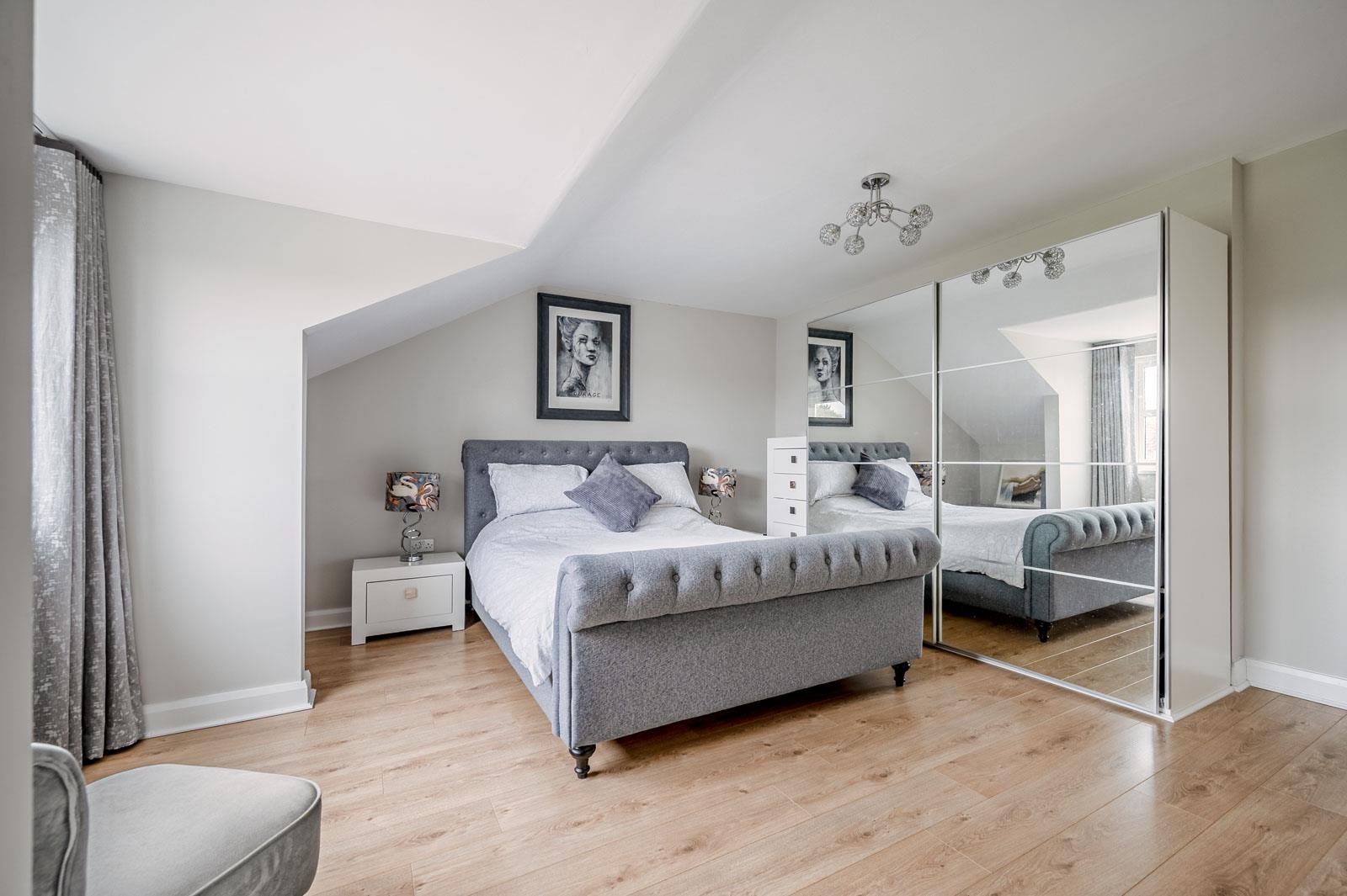 Wall to wall range of built-in wardrobes, laminate wood effect floor.