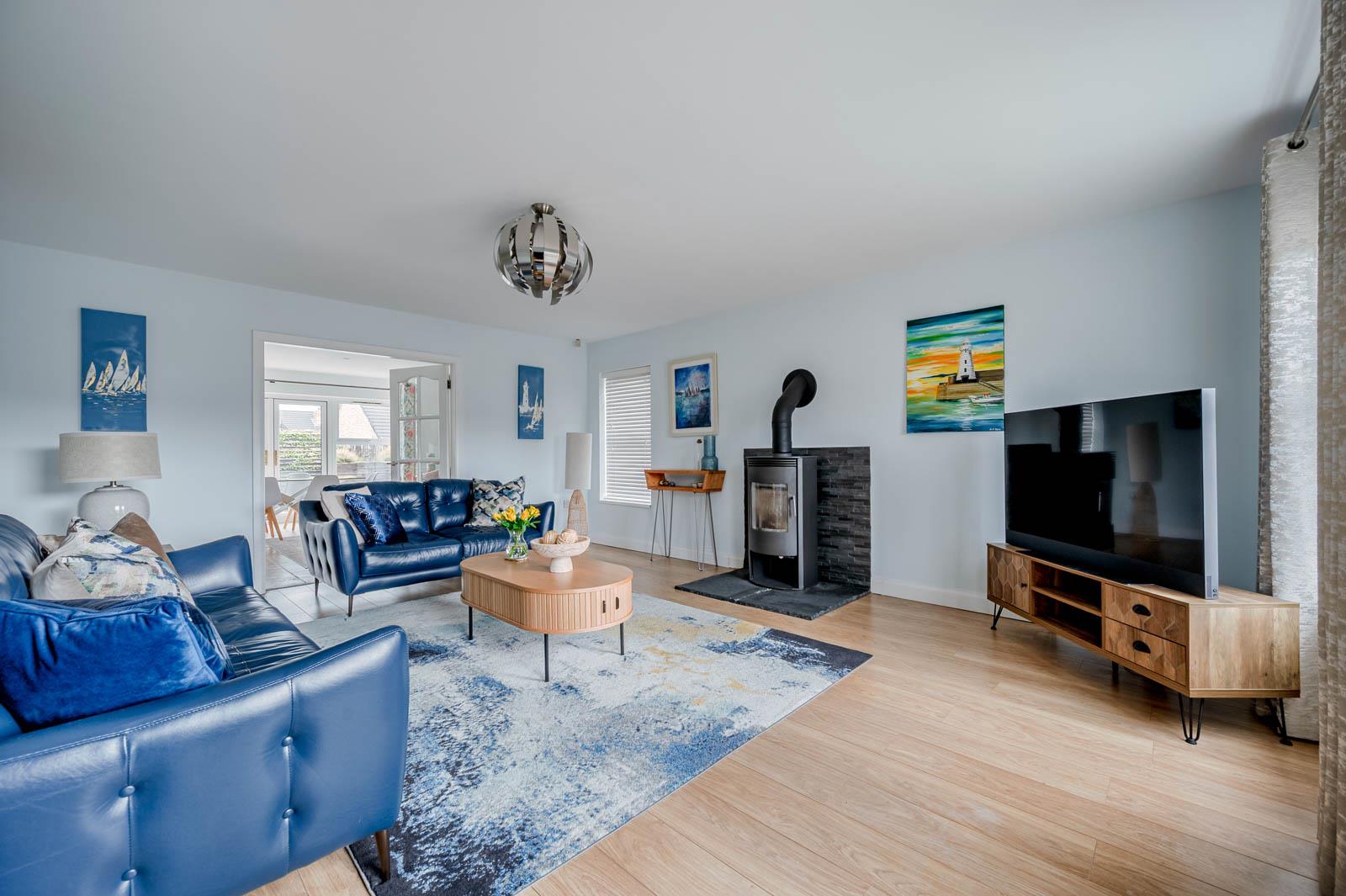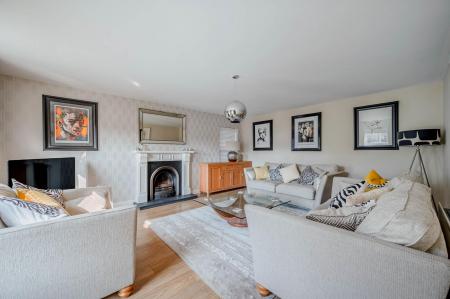 Living Room - (5.66m x 4.67m) - Cast iron multi-fuel burning stove on slate hearth, laminate wood effect floor, French doors to magnificent open plan kitchen with family and dining area.