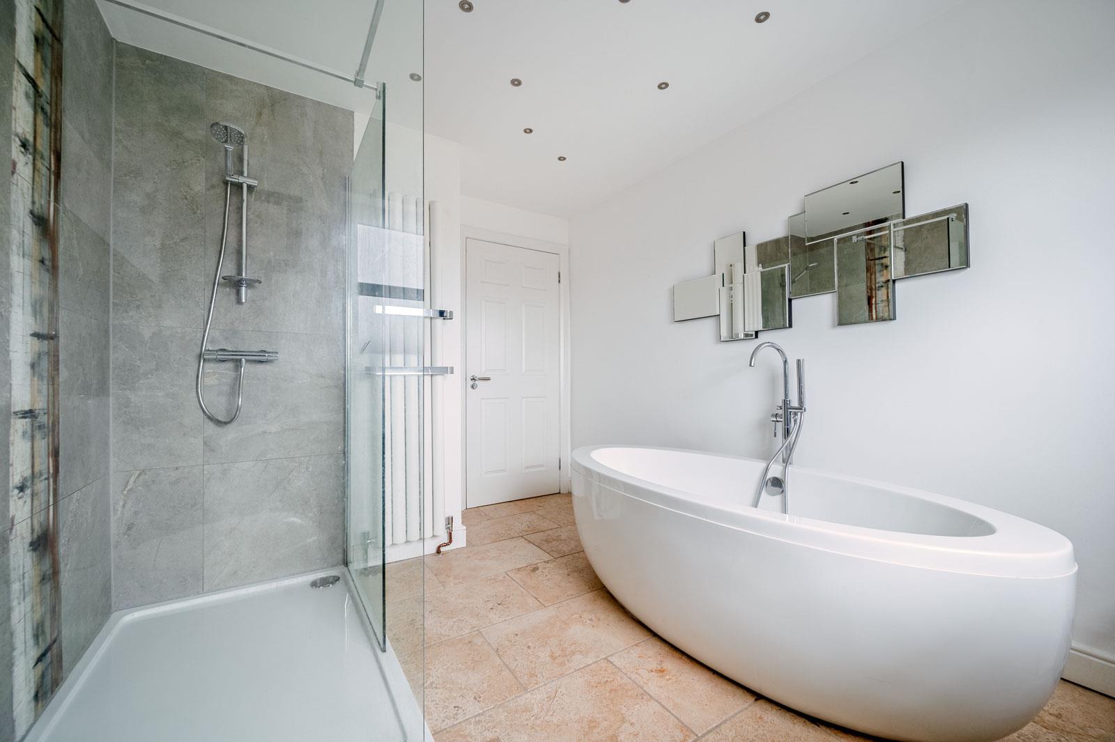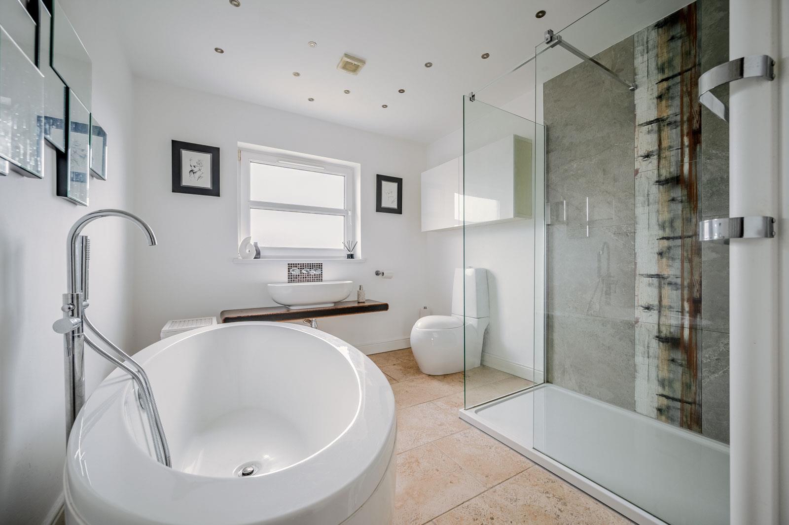 Luxuray Bethroom - () - Four piece white suite comprising: free standing bath with mixer tap and hand shower, separate built-in fully tiled shower cubicle, low flush WC, wash hand basin with mixer tap and display unit, fully tiled floor, extractor fan, heated towel rail.
