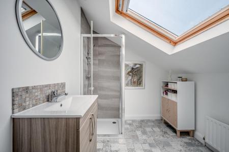 Ensuite Shower Room - () - White suite comprising: built-in shower cubicle, low flush WC, wash hand basin with chrome mixer tap and storage beneath, fully tiled floor, extractor fan.