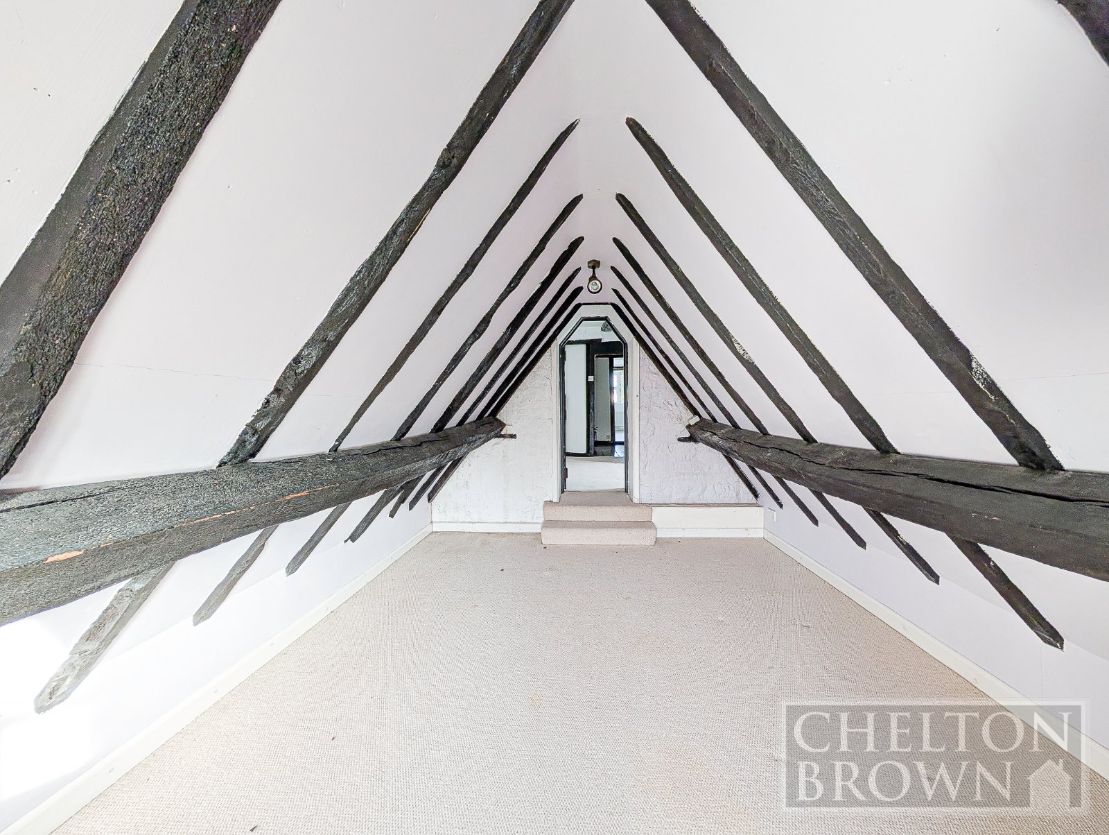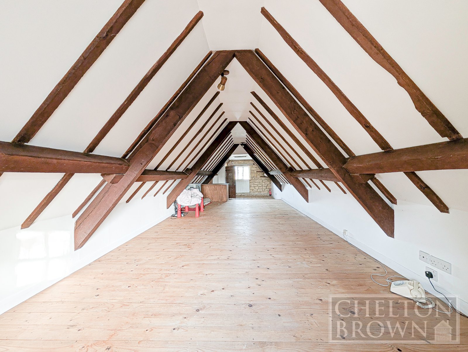 The principal bedroom sits at the front of the property, enjoying views over the field opposite and featuring a striking sandstone fireplace. Concealed behind one of the bedroom cupboards is a hidden staircase a delightful surprise leading up to a substantial attic room. Measuring over 11 metres in length, this versatile space offers enormous potential for a variety of uses, subject to the necessary consents.