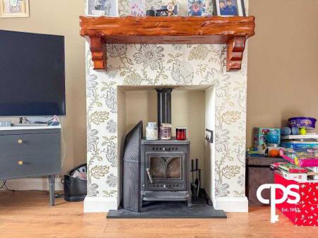 A bright, front-facing reception area featuring laminate wooden flooring and a multi-fuel stove on a slated hearth with a wooden mantelpiece. Radiators and electrical sockets are fitted throughout.Kitchen – 3.39m x 5.20m