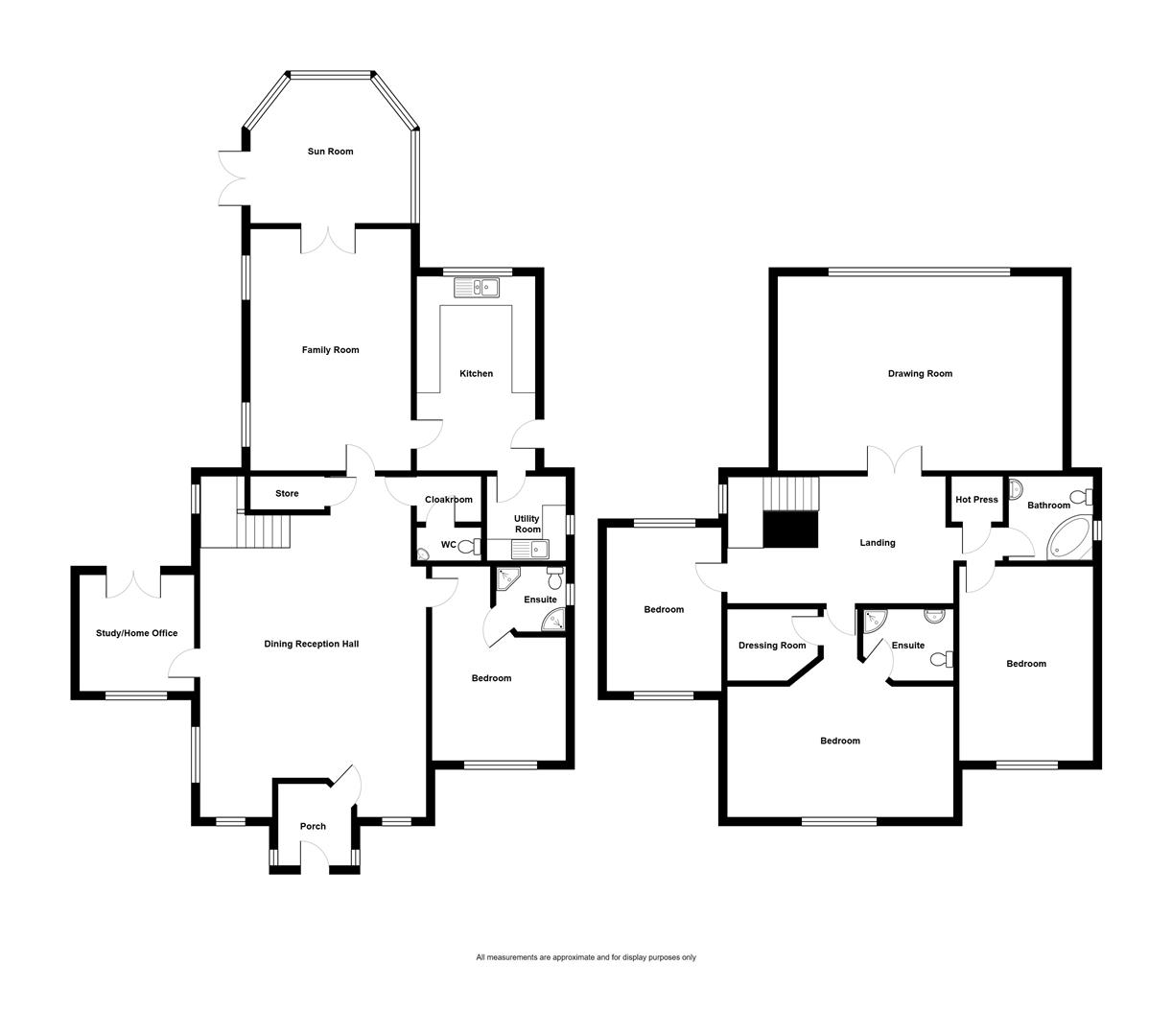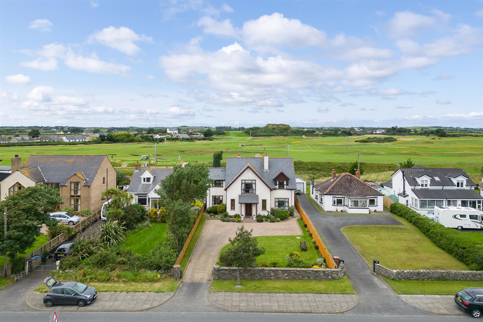 The property offers over 3,000 square feet of bright, spacious and flexible accommodation cleverly designed to maximise the wonderful aspects to both front and rear. As you enter the property you are welcomed by an impressive dining hall with attractive oak fireplace and open fire which leads through to a family room with feature sandstone fireplace and open fire and then through to a sun room with double glazed doors to outside. You also have a kitchen with granite work surfaces, guest bedroom with en suite shower room and that all important home office or study. Upstairs this property is further enhanced by a fabulous drawing room overlooking the golf course and a feature granite fireplace with gas coal effect fire. Three bedrooms all with sea views, including a main bedroom with dressing room and en suite shower room, as well as a bathroom complete the first floor accommodation.