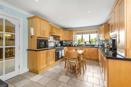 Kitchen: - (5.05m x 3.18m) - Range of high and low level units, granite work surfaces, one and a half bowl single drainer stainless steel sink unit with mixer tap, space for cooker range, stainless steel splashback, extractor fan above, integrated dishwasher, integrated microwave, recess for fridge freezer, aspect overlooking the golf course, fully tiled floor, cornice ceiling.