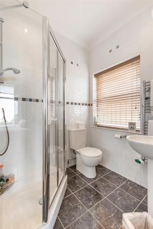 Ensuite Shower Room: - () - Three piece white suite comprising built-in fully tiled shower cubicle with Trevi shower unit, low flush WC, pedestal wash hand basin with mixer tap, fully tiled floor, fully tiled walls, chrome heated towel rail, extractor fan.