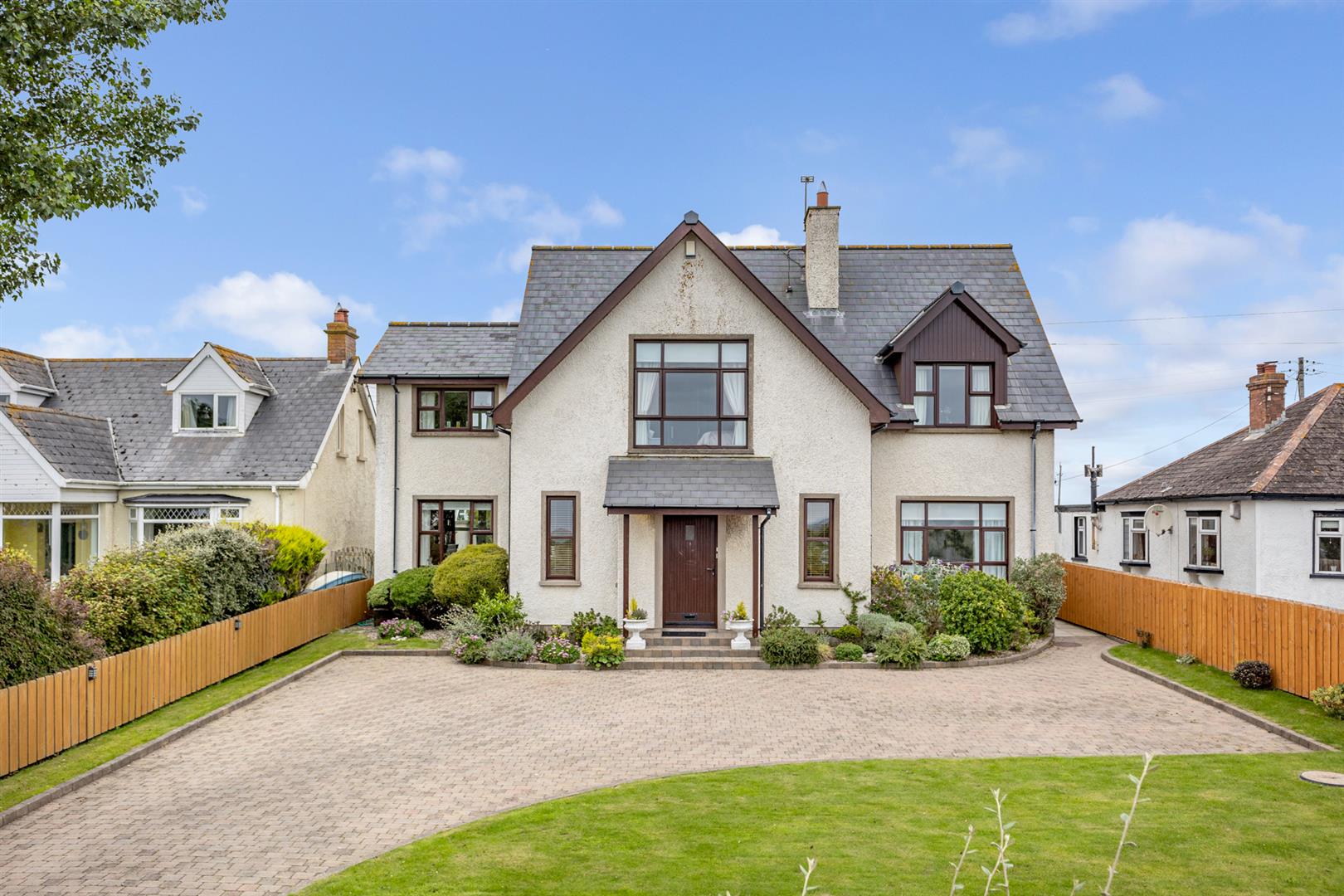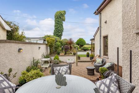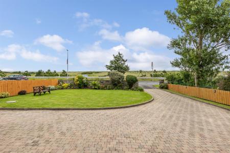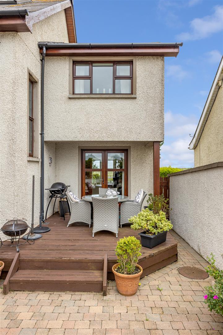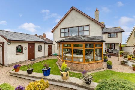 Outside - () - Well presented front garden in lawns with flowerbeds in plants and shrubs, driveway in attractive brick paviour with stone pillar entrance providing parking for numerous vehicles such as cars, caravans, boats and horse box, etc, immaculate rear garden in lawns with raised flowerbeds, array of colourful flowers, plants, trees and shrubs, brick paviour terrace areas and timber decked terrace, garden shed, uPVC oil tank and westerly aspect making it an ideal space for children at play, outdoor entertaining or enjoying the sun. The garden backs onto the golf course and also has pedestrian access to the course.