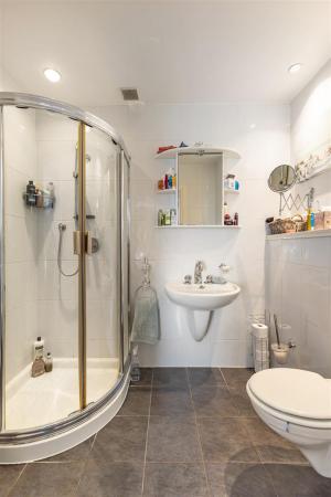 Ensuite Shower Room: - () - Three piece white suite comprising built-in fully tiled shower cubicle, floating wash hand basin with mixer tap, low flush WC, fully tiled floor, fully tiled walls, extractor fan.