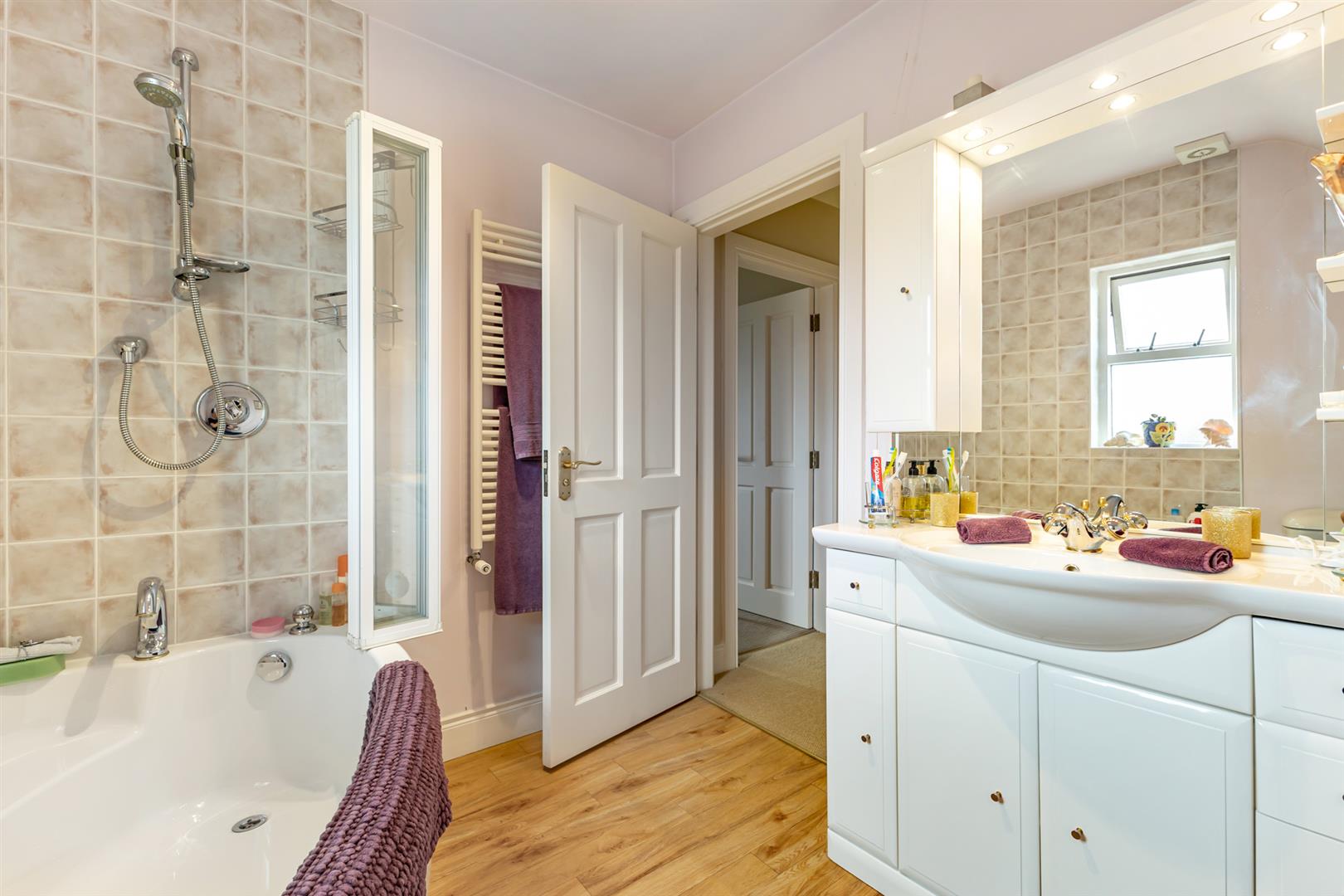 Bathroom: - () - Three piece suite comprising panelled bath with mixer tap and Mira shower over, wash hand basin with mixer tap and vanity unit, low flush WC, heated towel rail, extractor fan.