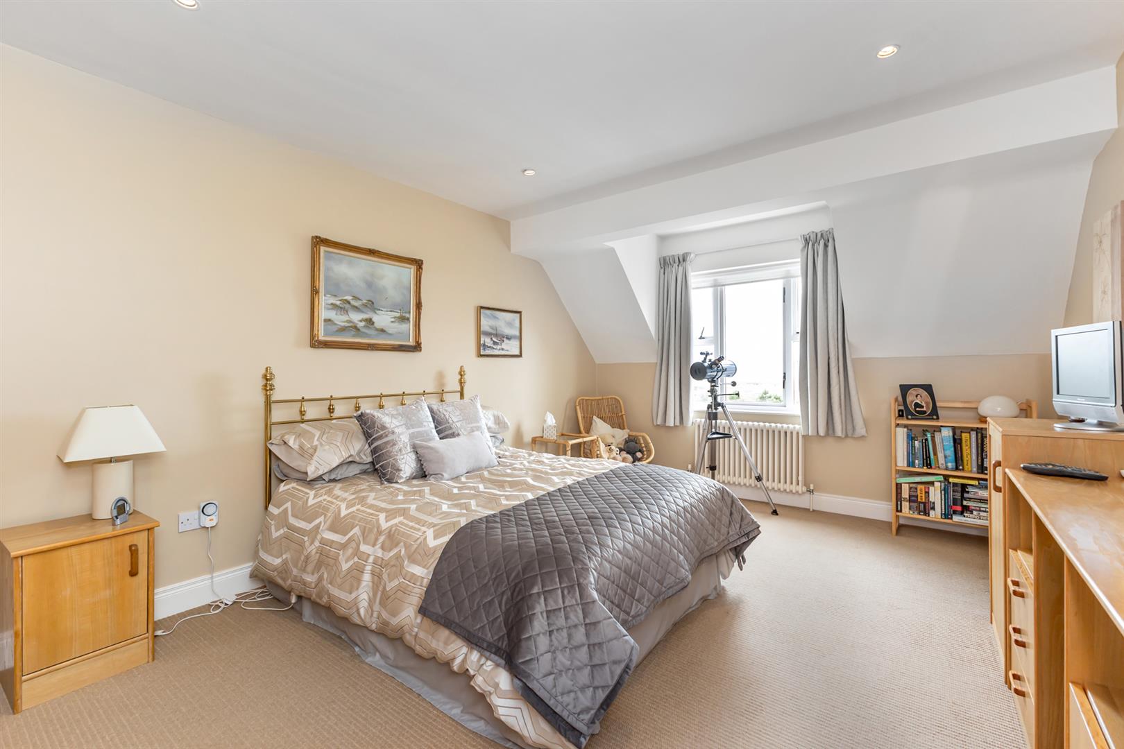 Attractive carved oak fireplace, slate inset and hearth, open fire, cornice ceiling, picturesque sea views, under stairs storage.