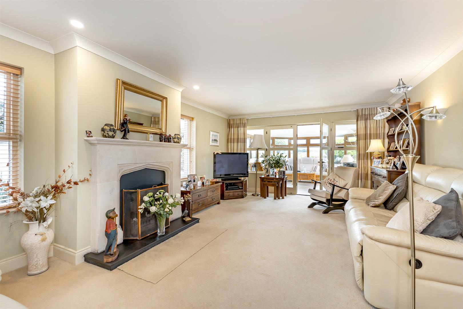 Attractive sandstone fireplace, slate inset, slate hearth, open fire, cornice ceiling, double glazed French doors to sun room.