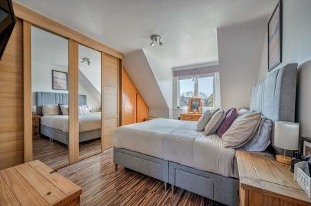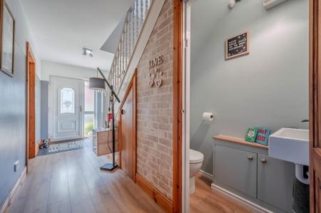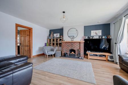 - Spacious Living Room with Laminate Wooden Floor, Attractive Red Brick Fireplace and Hearth, Open Fire