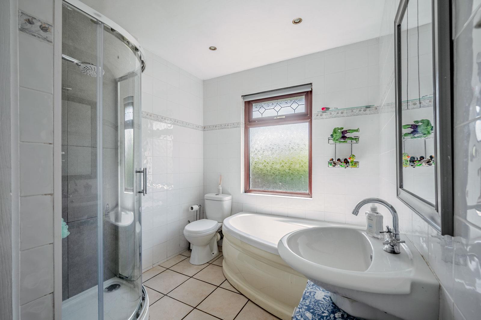 Bathroom - () - White suite comprising of a bath, elecric power shower, pedestal wash hand basin, low flush wall hung wc, tiled walls and floors.