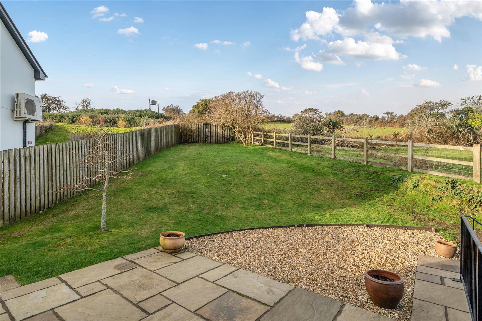 Outside - The rear garden has been thoughtfully landscaped to maximise the space available and make the most of its attractive outlook. Designed for both ease of maintenance and enjoyment, the garden offers a generous lawn alongside well placed patio areas, ideal for outdoor dining and entertaining. Mature planting and defined borders provide structure and privacy, while the garden's position backing onto open fields creates a peaceful setting and a strong sense of space.