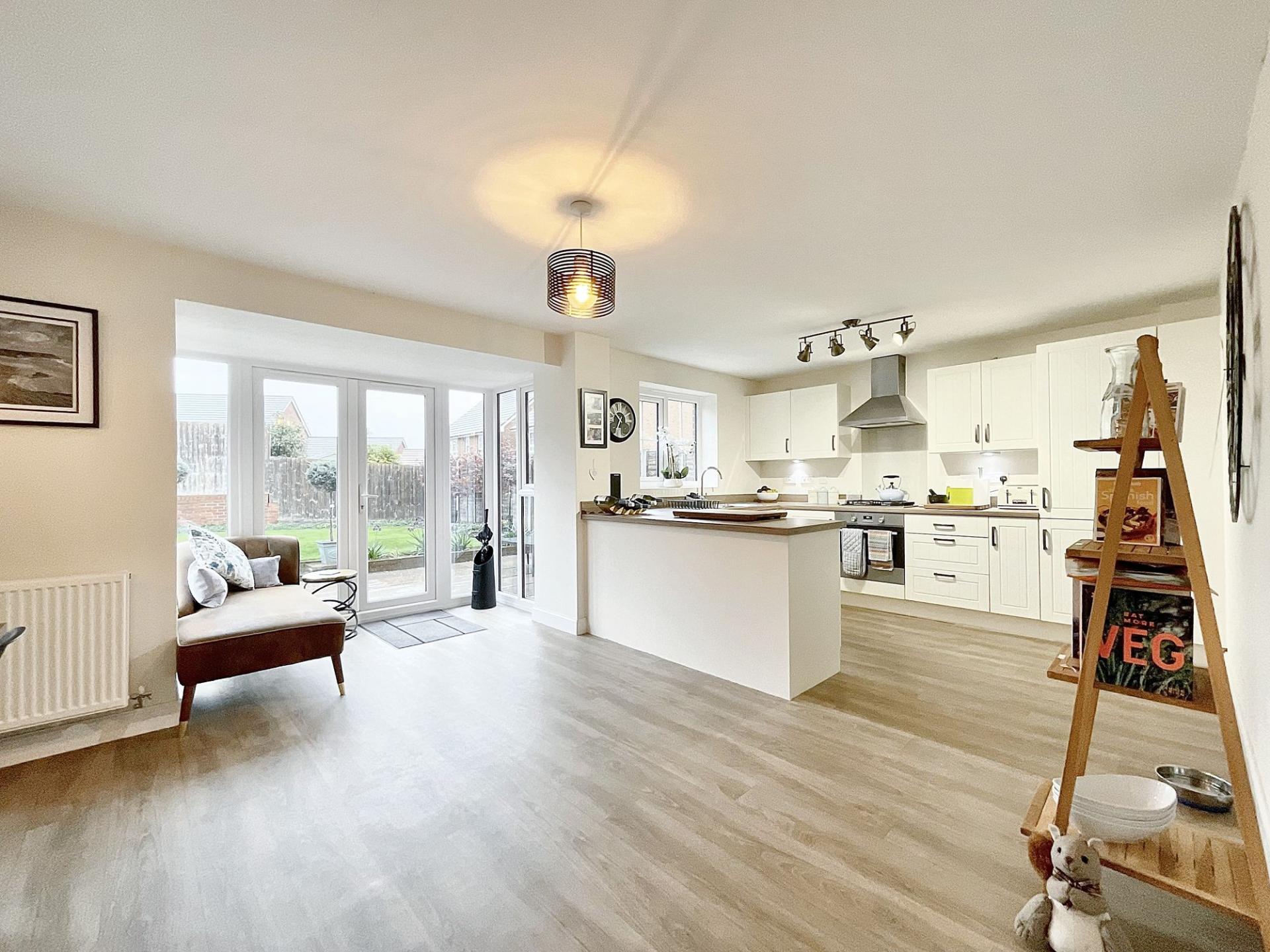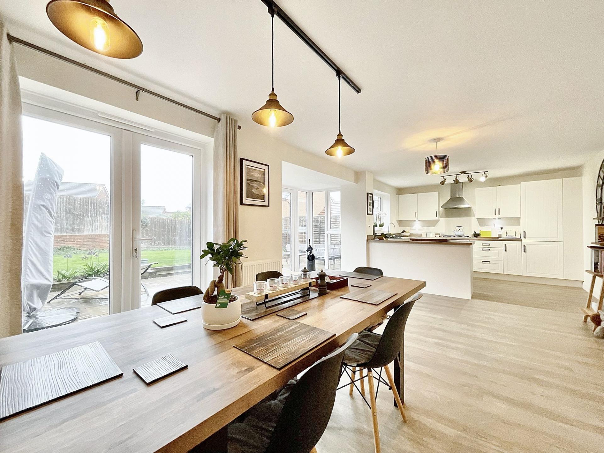 - Spacious Open-Plan Kitchen/Diner – Modern kitchen with integrated appliances, ample counter space, large window, and two sets of French doors opening to the rear garden.