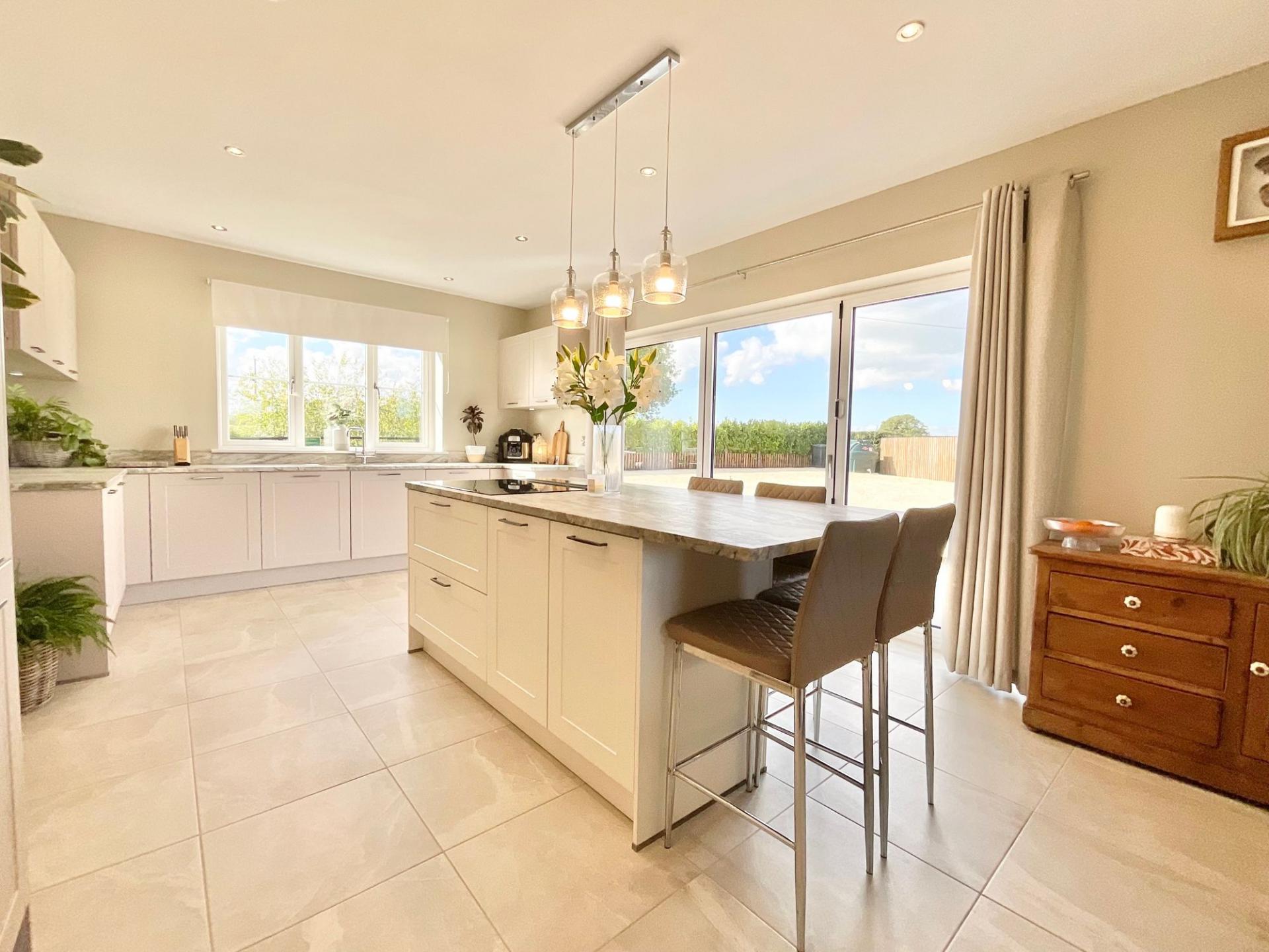 - Stunning German Häcker kitchen with island, quartz worktops, and bright sitting area with garden views