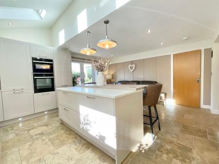 At the heart of the property lies a spectacular kitchen and family room, fitted with a high-end German Häcker kitchen complete with quartz worktops, boiling hot water tap, integrated wine cooler, 5-ring induction hob with extractor, double oven, dishwasher, and fridge/freezer. The layout is both practical and stylish, flowing effortlessly into a generous living area where French doors open out to the garden, inviting natural light to flood the space.