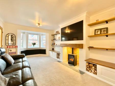 - Stylish lounge with oak mantelpiece, bespoke storage and feature electric fire